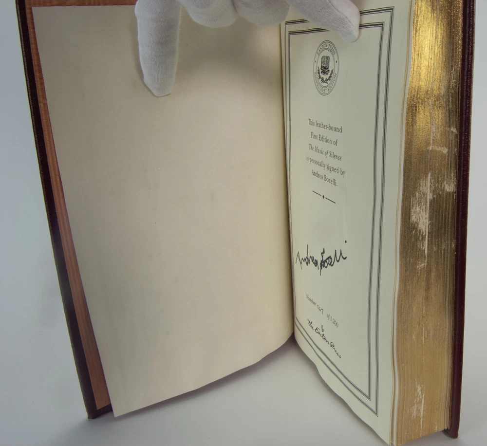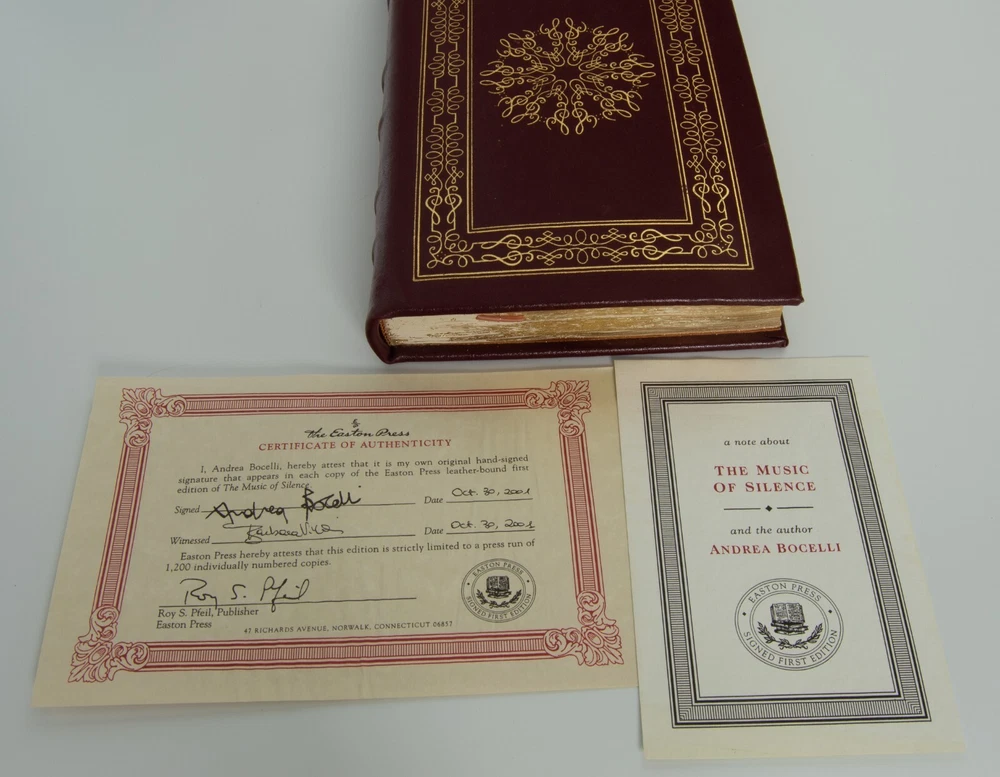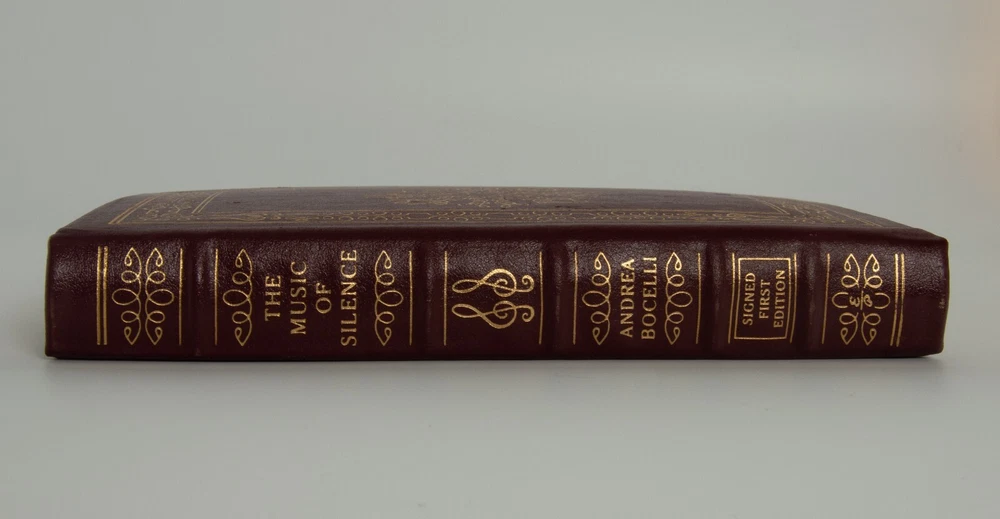Easton press signed editions The music of silence Andrea Bocelli Andrea Bocelli was born on September 22, 1958 in Lajatico, near Pisa, Italy. As a tenor and singer, he has performed classical and pop music, popularizing classical music in the international pop charts. Born visually impaired, he became completely blind at the age of 12. Nevertheless, he has recorded 14 solo albums, two of which have gone platinum and seven gold. Originally published in 2011, The Music of Silence, through an alter ego named “Amos Bardi,” Andrea Bocelli tells his own story in the form of an autobiographical novel. Thank you for your interest in Carter & Hammer. These highly collected Easton Press heirloom-quality editions are bound in luxurious leather bindings, hand cut from specially tanned hides of fine quality. 22kt gold accents are carefully stamped on the traditional hubbed spine, superb printing on acid-neutral pages that are sewn with gilded page ends for beauty, as well as to seal out moisture and dust. Each book is beautiful in its entirety and a perfect gift or addition to any collection. Each is one of a limited number, so value is bound to increase over time! Outlined below is any wear that rises above the traditional wear that would be associated with a used book. Please continue, however, to reference and scrutinize the pictures provided above. Please ask any questions you may have before purchasing this book. Please keep in mind that we are not professional graders, but we do our best to give an accurate and complete description. This book has significant wear throughout. Please see the descriptions on the parts of the book and the pictures. The cover is a currant red with intricate gold inlays. Cover : There is some damage in the form of scuffing to the leather and some warping in the form of bulging. This is most prevalent on the front cover. On the side or the spine of the book it is minimally visible on the bottom and the back of the book it is the least visible and the back of the book it is not immediately visible if at all. Page Edging : The edges of the book have significant damage which is most visible on the bottom, slightly less on the side, and less so on the top. The damage on the top edge is some discoloration likely representing water damage. Head/Tailcaps : The headcap appears attached to the inside spine when book is closed and the tailcap is loose from the inside of the spine. The hinge operates appropriately on the top of the book and is also loose on the bottom. End Sheets/Inside Covers : The front endsheet and back endsheet do not appear to have any staining but there is some minor wrinkling which is more prevalent on the front and difficult to see with the naked eye in the back. Textblock : Most of the pages (if not all to varying degrees) have wrinkles. From before the middle of the book until close to the end, there is staining on the bottom pages of the text block. The staining is guessed to be water damage. Other : The signature is in excellent shape but the page it is on is slightly wrinkled. There is a certificate of authenticity signed and verified by the author and the published. It also has wrinkles. The inserted card is also present and in excellent shape. Book Information Pages: 243 with a great many pictures in the middle Dimensions (inches): 9.5 x 6.33 x 1.5 Signed Edition: 567 of 1,200 Return policy At Carter & Hammer! We strive to offer our customers quality products at excellent prices. If you are not completely satisfied with your purchase, please let us know within 14 days of the shipment date for a full refund. SHIPPING & other items PACKAGING DETAILS The book is wrapped securely and carefully to ensure its present state is preserved. Often, we use boxes from other sources and custom make the shipping box. This helps the environment through reuse and helps ensure the product is safely packaged. SHIPPING Shipping for books is done by media mail (2-8 business days), however faster shipping is available upon request for an additional fee. SHIPPING DISCOUNTS Please feel free to browse through other products we offer, and we will be happy to provide you with combined shipping . Carter & Hammer! will always strive to offer an eclectic variety of products at excellent prices. We hope you enjoy your experience with us and please let us know if there is anything we can do to further accommodate your shopping experience!