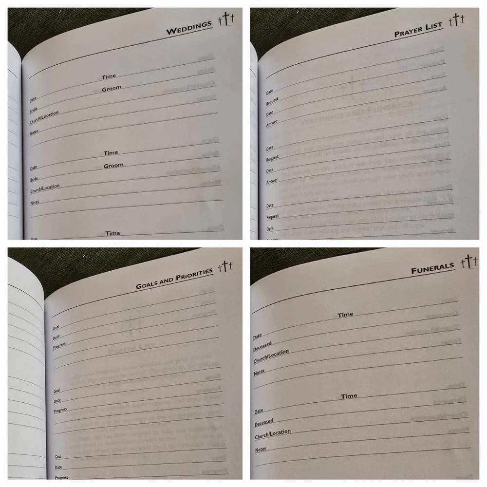 Unused copy of The Pastor's Journal. Please note: Included calendar only goes up to 2005, as this is an old publication. A pastor's week is filled with an endless assortment of demands and events - from weddings and funerals to sermon preparation and staffing issues. Until now, there was not a single resource that pastors could carry with them to manage these multiple demands. The Pastor's Journal, covered in rich Eurobond leather, includes the following features requested by pastors: 152 pages for sermon notes and preparation Scripture reference guide Prayer lists Staff / congregation / hospital contact information Funeral and wedding planner Priorities / goals for the year Sermon calendar Quotes to inspire and encourage And much more.