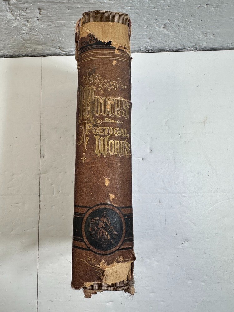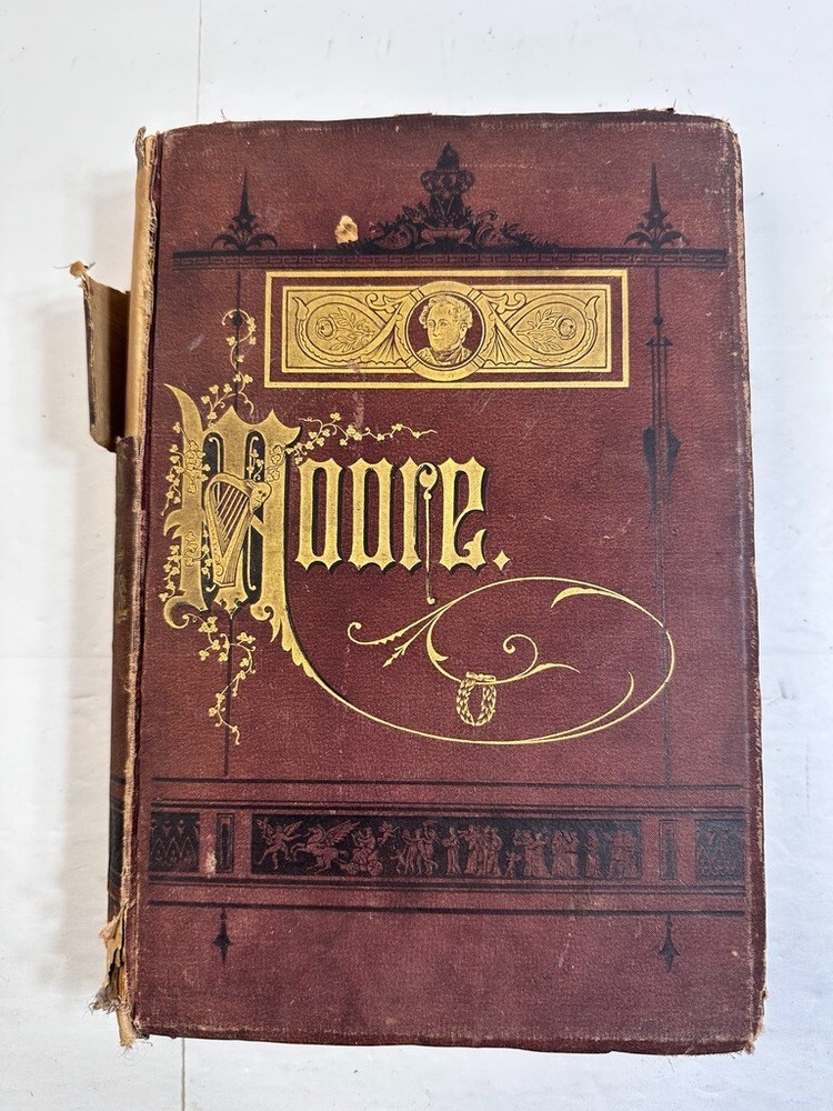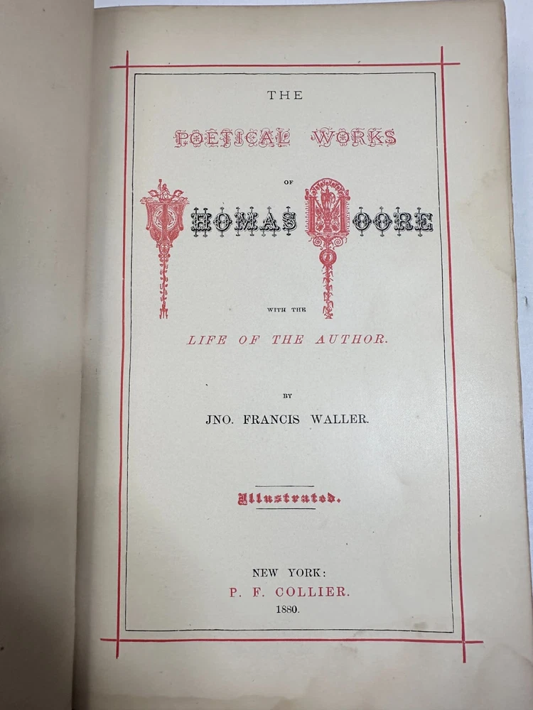 This is a collectible edition of Thomas Moore's poetic works published by P. F. Collier in 1880. The book is approximately 10.5" tall and has a leather binding. It is written in English and contains illustrations. The book is an original copy and has not been modified. The book's topic is poetry and it is categorized under literature and fiction. Overall the book is in decent shape given it's age. The plates are all present and look good. I took pictures of several to show how they look. Note that we are a Public Library, we receive donations from members of our community, and we use the proceeds from the sales of these donations to help support our library and library programs. Please look closely at all pictures to see exactly what you are getting. I try to take many photographs in order to show the overall condition of the book. Don't hesitate to reach out if you have any questions. Thank you for looking.
