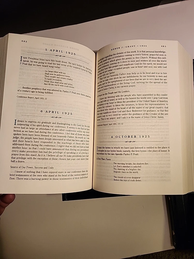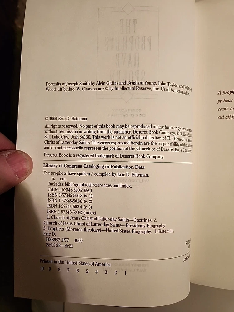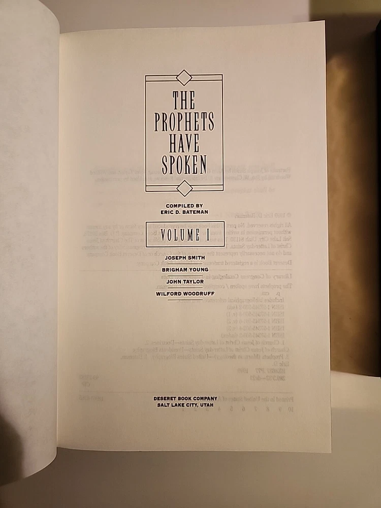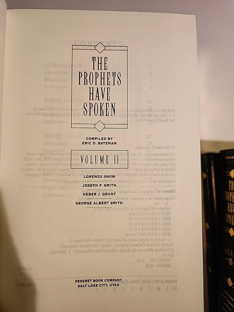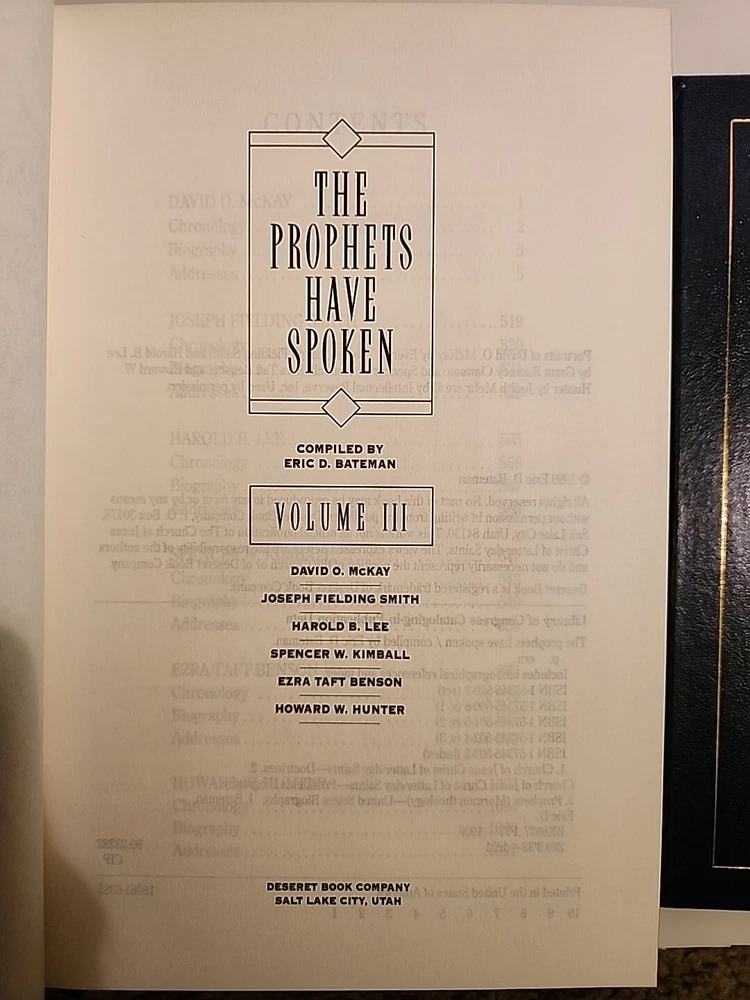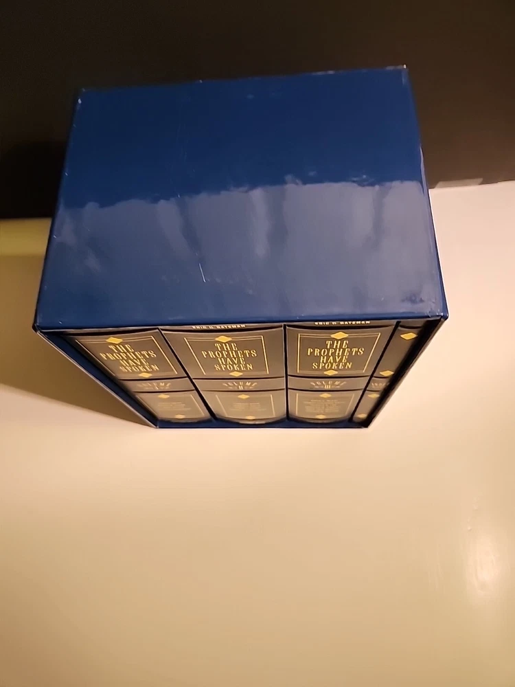 "The Prophets Have Spoken" is a 3-volume box set published by Deseret Book Company in 1999. Written by Eric Bateman, this nonfiction book is intended for young adults and adults interested in the teachings of the Church of Jesus Christ of Latter-Day Saints. The set features faux leather-bound hardcover editions and covers topics related to Christianity and Mormonism. It is a collector's edition in English, showcasing the words of prophets in the Latter-Day Saints faith. This is a like new set of hardcover binding books blue leather like. They have minimal wear. The box has scratches and scrapes bending and dents. No markings or hilighting. Clean text.