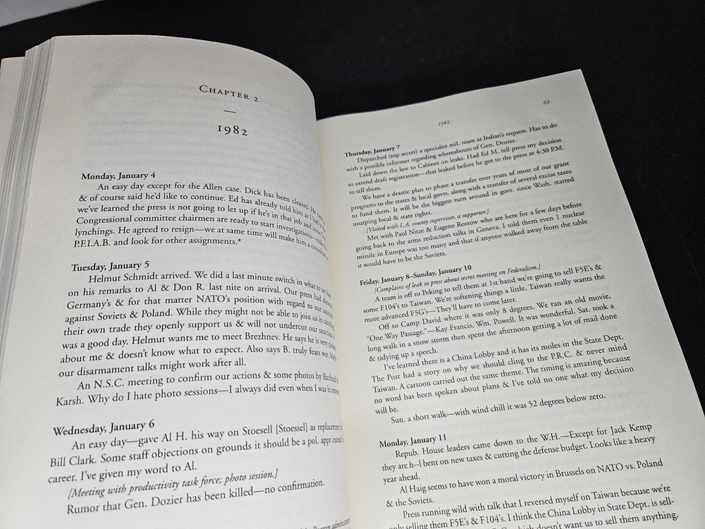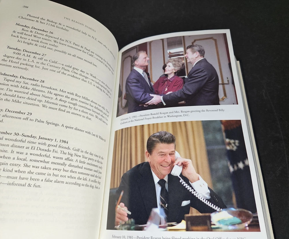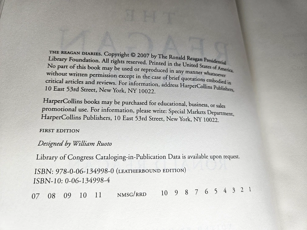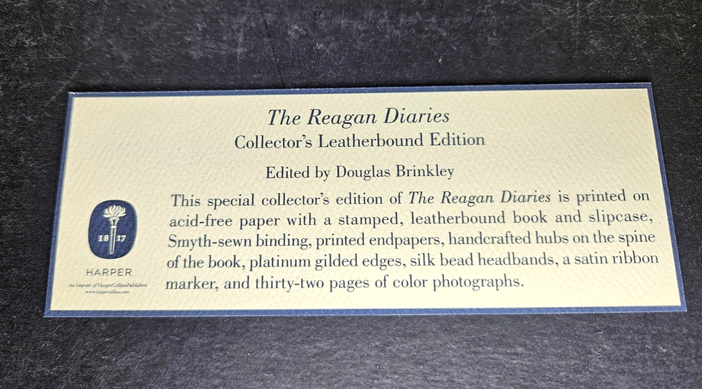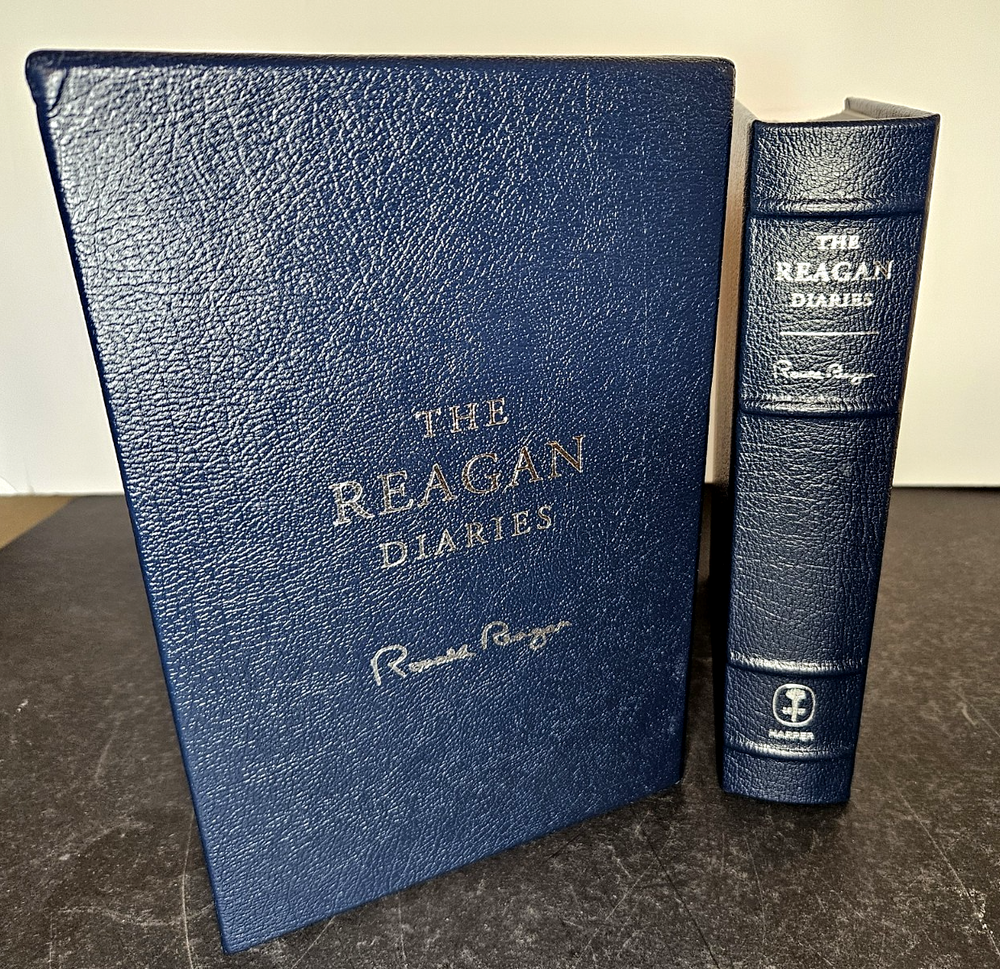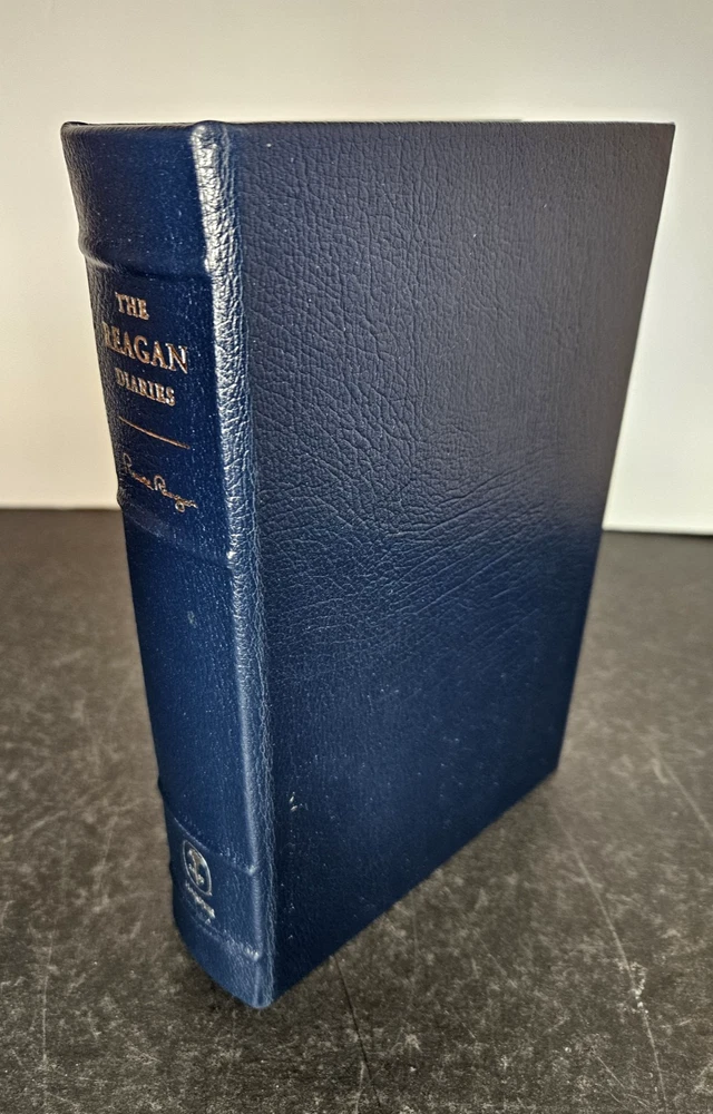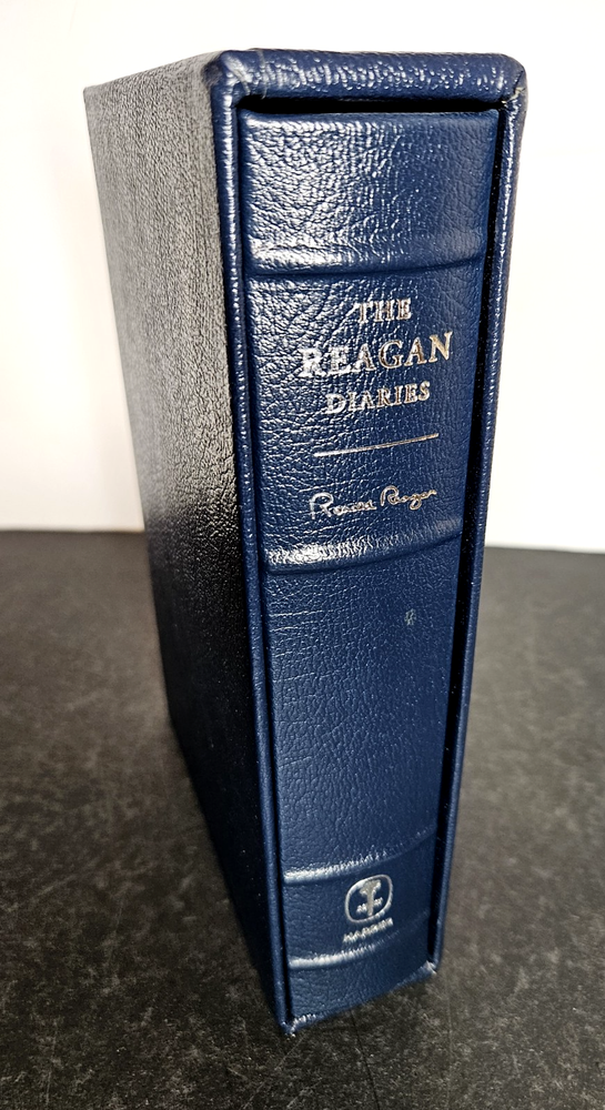 Being offered for your consideration is a Leather Bound - Slipcase Hardback copy of " The Reagan Diaries" by Ronald Reagan. Edited by Brinkley . Appears unread. Very clean. No writing or highlighting found. Photos are of the actual book being sold. Additional Information Published by HARPER Copyright - 2007 Leather Bound Hardback Silver Gilt Edge Papers Pages - 767 Ribbon Book Mark 9-3/4 in. tall x 6-1/2 in. wide x 2-1/8 in. thick Printed in the United States of America Smoke-free environment. Ships insured next business day, Monday - Friday. International shipping and payments are not available. Please e-mail any questions before bidding as this item is Not returnable . Once you receive an invoice from eBay, please post payment within (2) days or item is subject to being relisted. Thank you and we look forward to doing business with you.