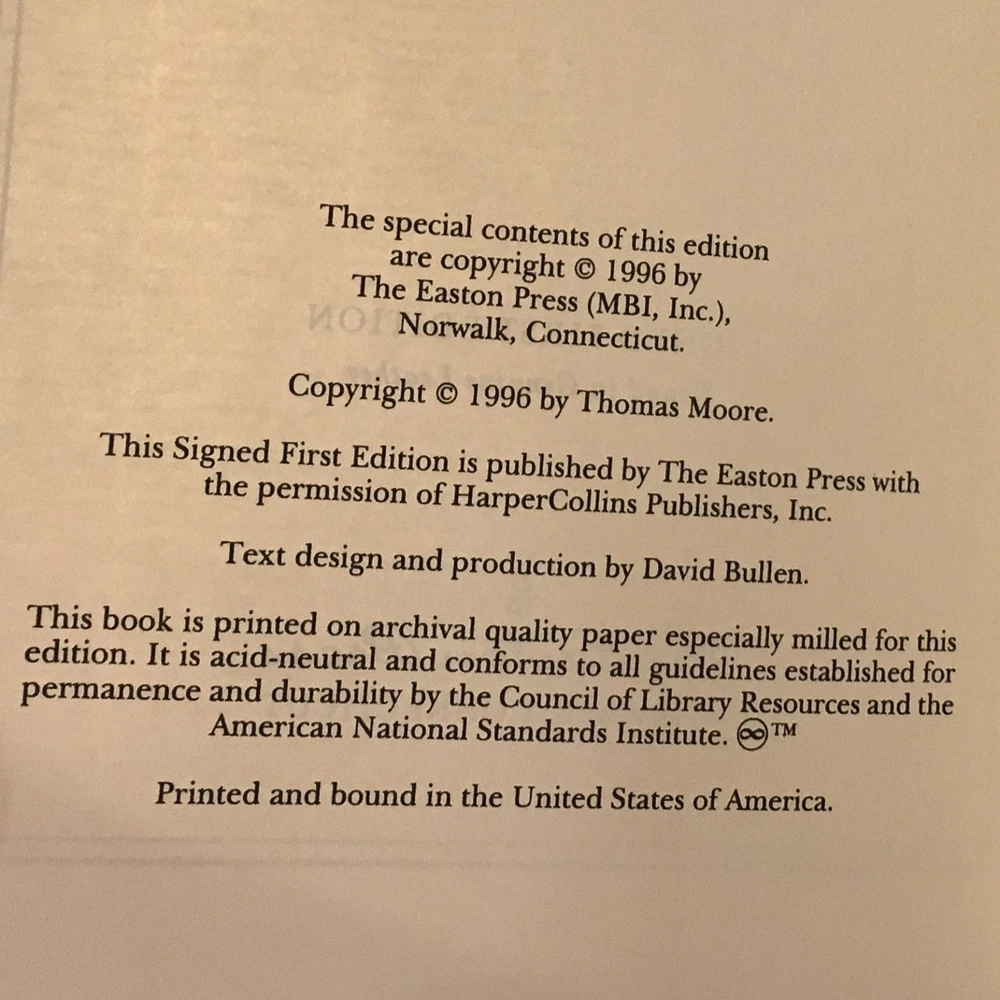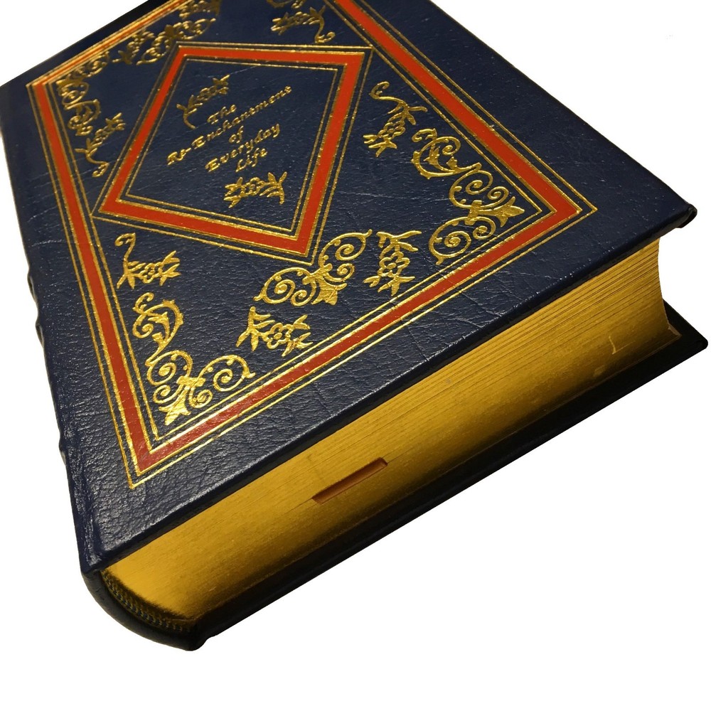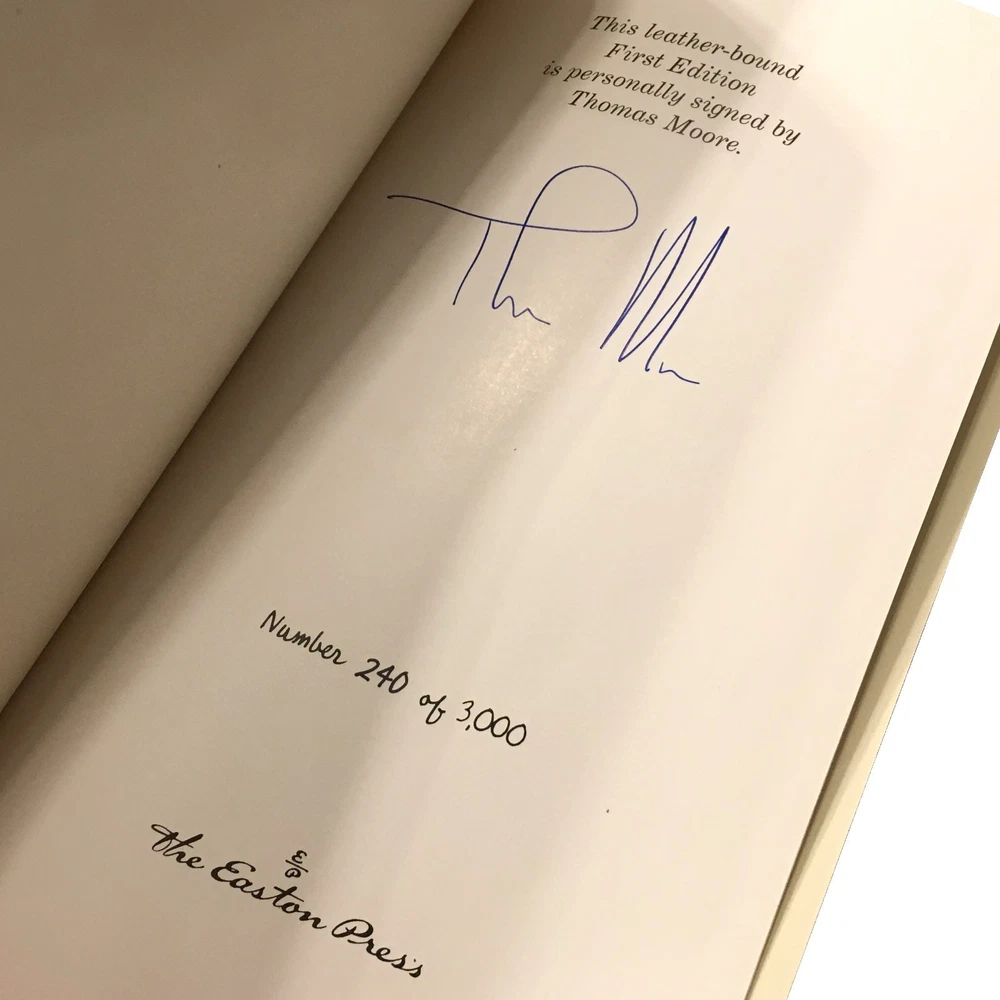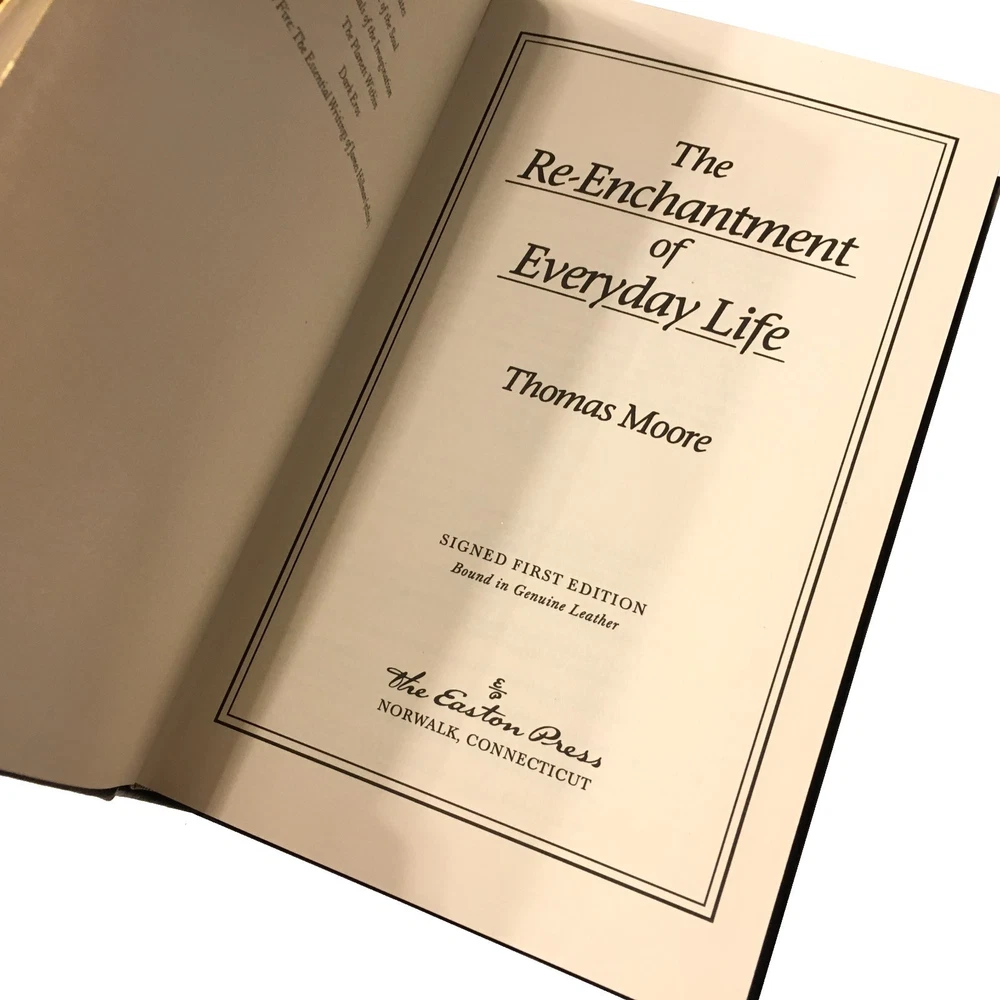 This book is titled ''The Re-Enchantment of Everyday Life'', authored by Thomas Moore. It is published by Easton Press, part of the series: Signed First Editions. It was published in 1996. The book is Very Good (VG), or a book that shows some small signs of wear. There is no owner's plate attached, nor any owner's mark of any kind. Covers are in mint condition, with no signs of wear at all. No nicks or scratches to the leather, and no scuffing to the gilded artwork and lettering. Will display perfectly on your bookshelf. The page block gold gilding shows light scuffing, but is still rated VERY GOOD. It has a few spots of paint-like blemishes; with the careful application of a draftsman's eraser, you may remove it from the underlying gold leaf, but I have not attempted this. See pics. The spine appears perfect with no wear. Silk end papers are pristine; no imperfections.