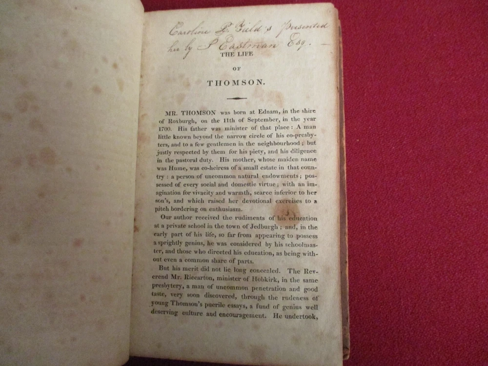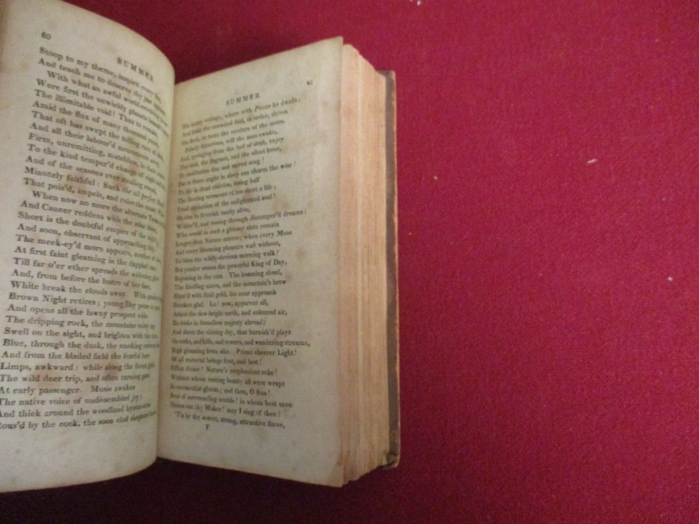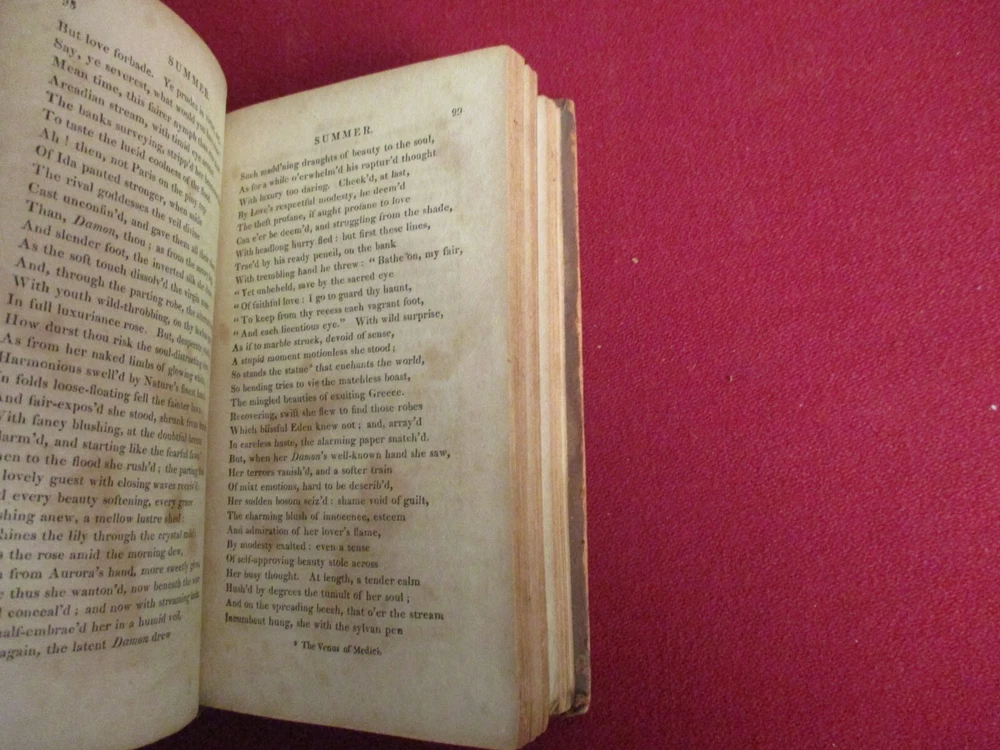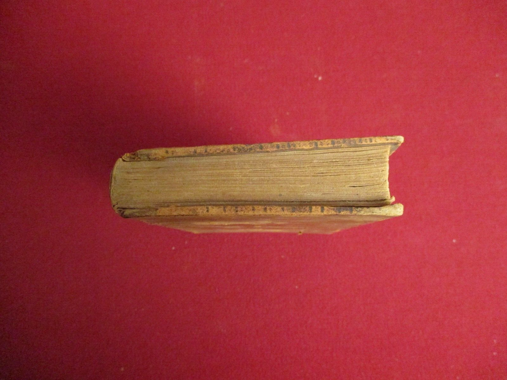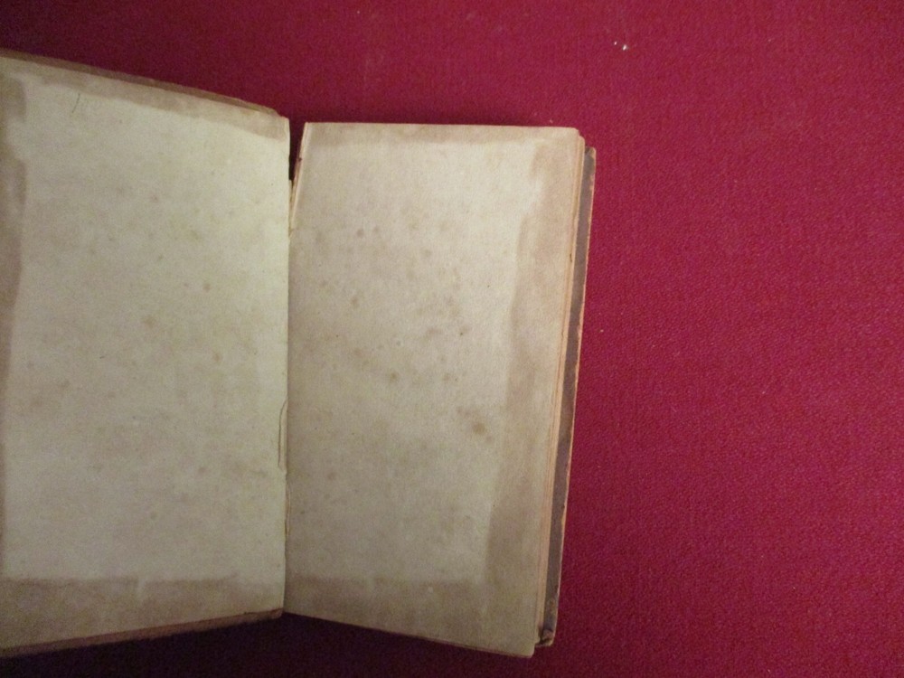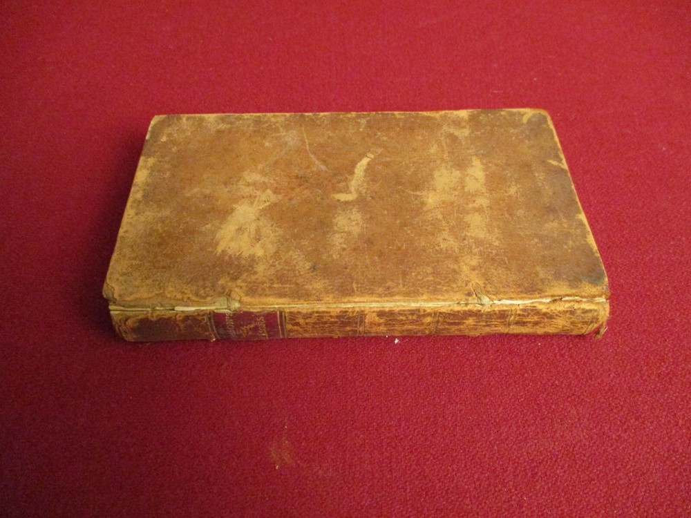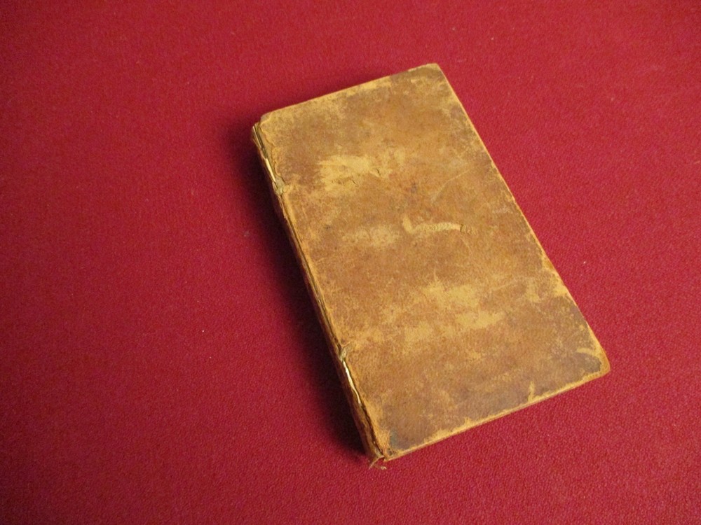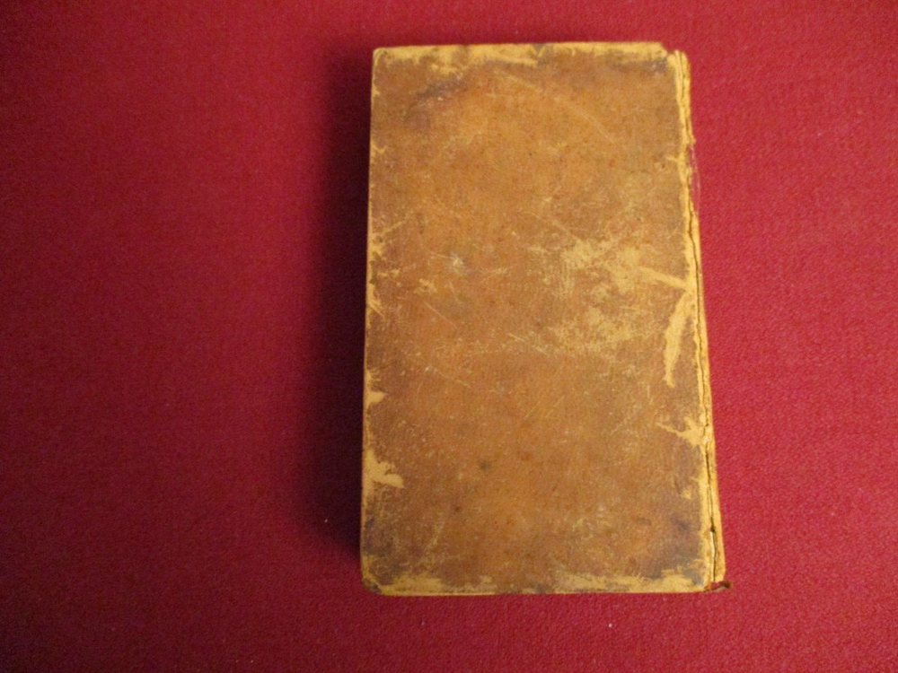 Vintage, small (3 1/4 x 6 inch) leather bound book in acceptable/good condition. The leather binding is well worn. The front cover is slightly detached, being held in place by two pieces of string. Two pages have a written name or inscription, there is a blank page in the middle with a penciled message. There is foxing on pretty much every page. There are a few small dogears. Free media mail shipping.