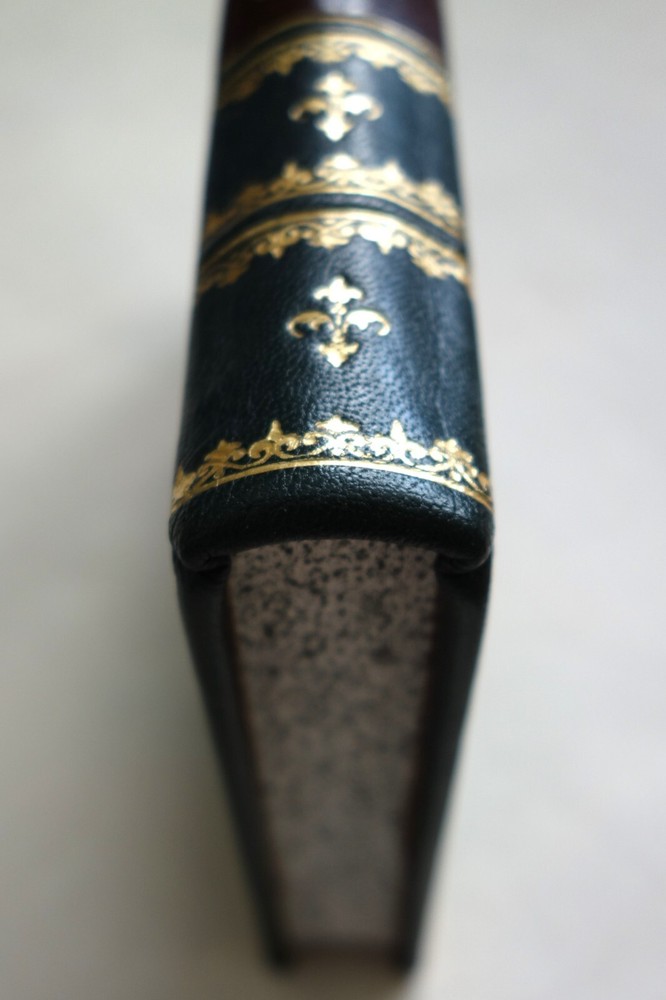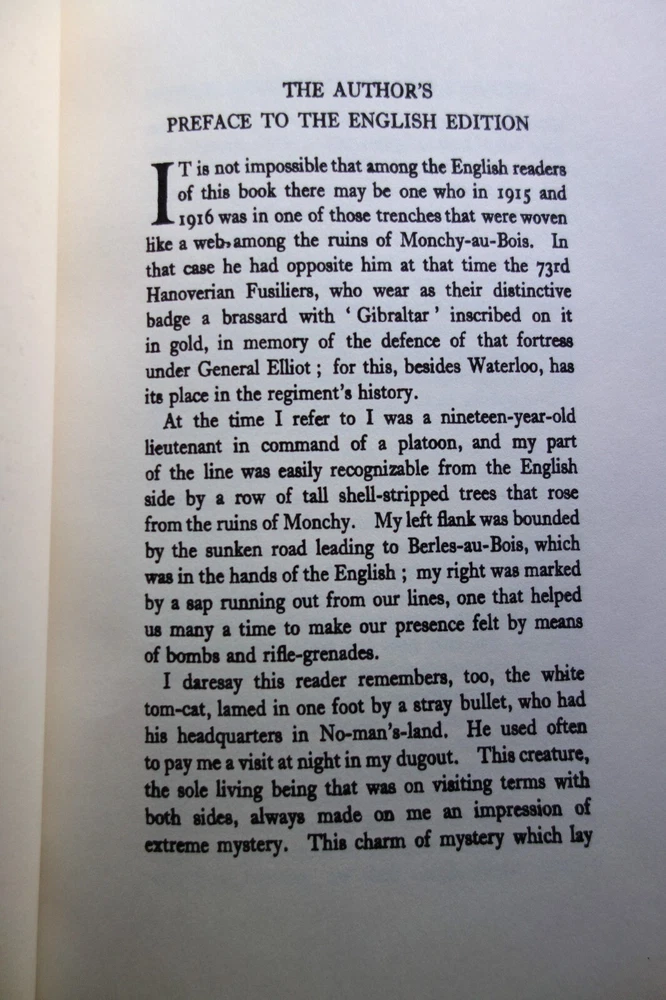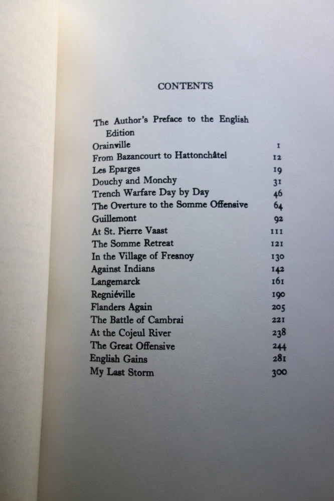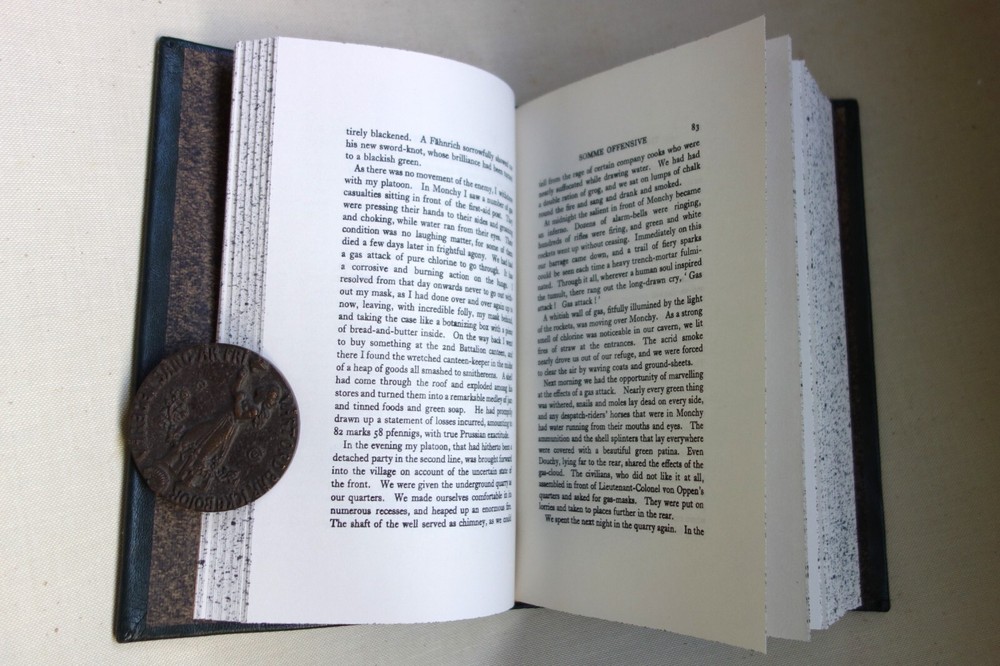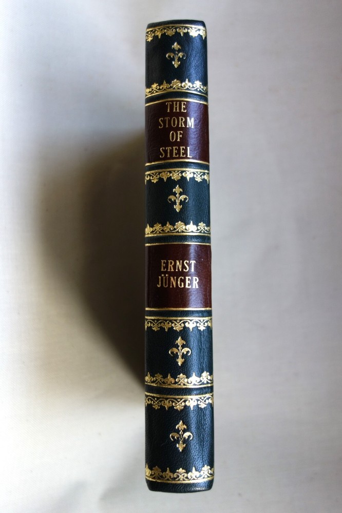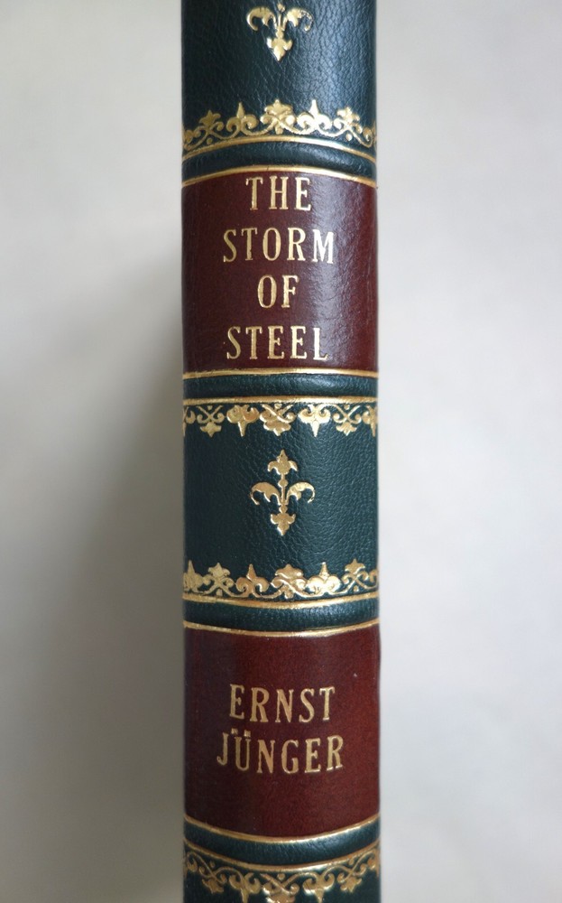 The Storm of Steel by Ernst Junger Original English Translation by Basil Creighton Includes the author's preface to the English edition Hardcover full leather forest green goat with brown split sheep labels. Traditional binding sewn on five raised bands. Hand tooled. German pulled paste-paper endsheets. Hand sewn Gold and cream silk headbands.