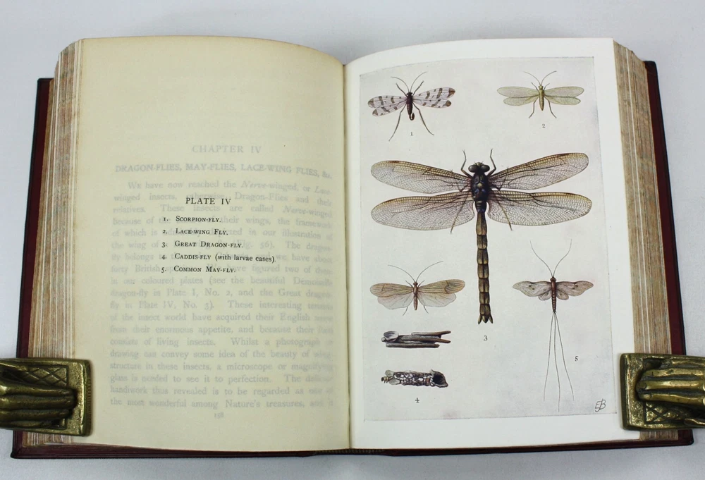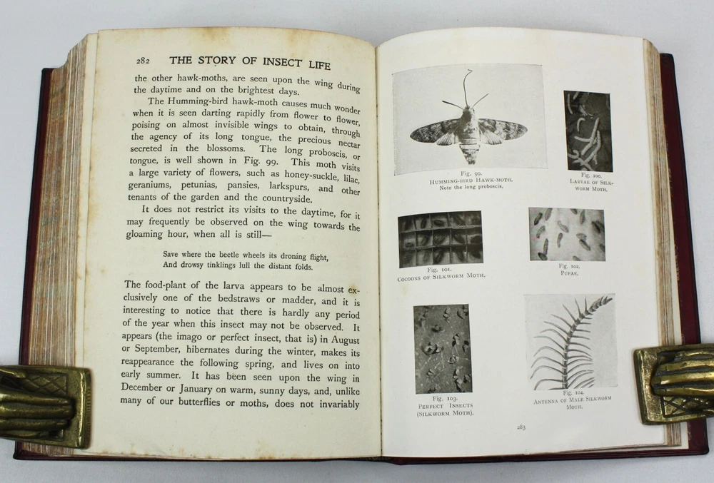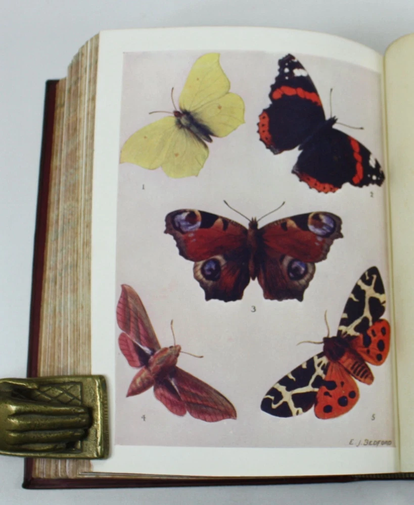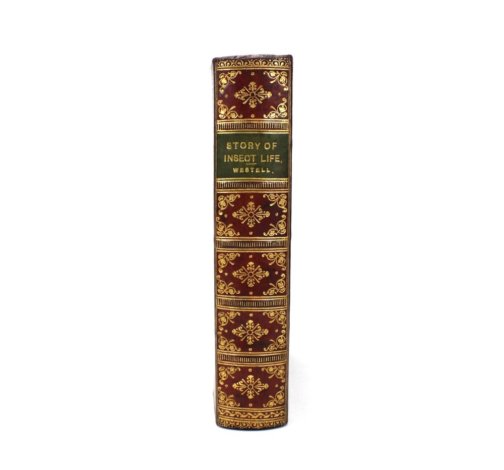 The Story of Insect Life, by W. Percival Westell, F.L.S., M.B.O.U. With 138 Illustrations from Photographs by Messrs. H.W. Shepheard-Walwyn, M.A.; C.F. Oakley; J.H. Crabtree. and others; and Eight Coloured Plates by E.J. Bedford. Published by Robert Culley, London. Undated, but Preface dated to 1907, and prize inscription dated to Xmas 1917. Worldcat lists 1907 as the pubication date. Presumed first edition. Fairly scarce - Worldcat identifies just 20 institutional holdings. A very good full red leather hardback in a full leather prize binding from 'Naish House'. Gilt "Naish House' and border to front cover with tooled gilt spine, raised bands and green morocco title label. Some minor shelf wear to covers. Red feathered marble endpapers, matched to text block edges. 'Star Prize' presentation inscription from a 'Headmaster' to first free endpaper. Inner hinges all intact and soundly bound. The text is generally clean and bright, but with some age spotting to endpapers, title, and first and last few pages. Otherwise there is occasional scattered spotting, particularly to the reverse of the tissue guarded colour plates. Beautifully presented with illustrated coloured plates and black and white photographs throughout. An attractive volume. Text in English. xv + 339pp + Plates with printed tissue guards (all as called for). Dimensions: approx 193mm high x 148mm wide x 42mm deep. Weight: approximately 682g (unpacked). Published by Robert Culley, London. Undated, but Preface dated to 1907, and prize inscription dated to Xmas 1917. Worldcat lists 1907 as the pubication date. Presumed first edition. Fairly scarce - Worldcat identifies just 20 institutional holdings. A very good full red leather hardback in a full leather prize binding from 'Naish House'. Gilt "Naish House' and border to front cover with tooled gilt spine, raised bands and green morocco title label. Some minor shelf wear to covers. Red feathered marble endpapers, matched to text block edges. 'Star Prize' presentation inscription from a 'Headmaster' to first free endpaper. Inner hinges all intact and soundly bound. The text is generally clean and bright, but with some age spotting to endpapers, title, and first and last few pages. Otherwise