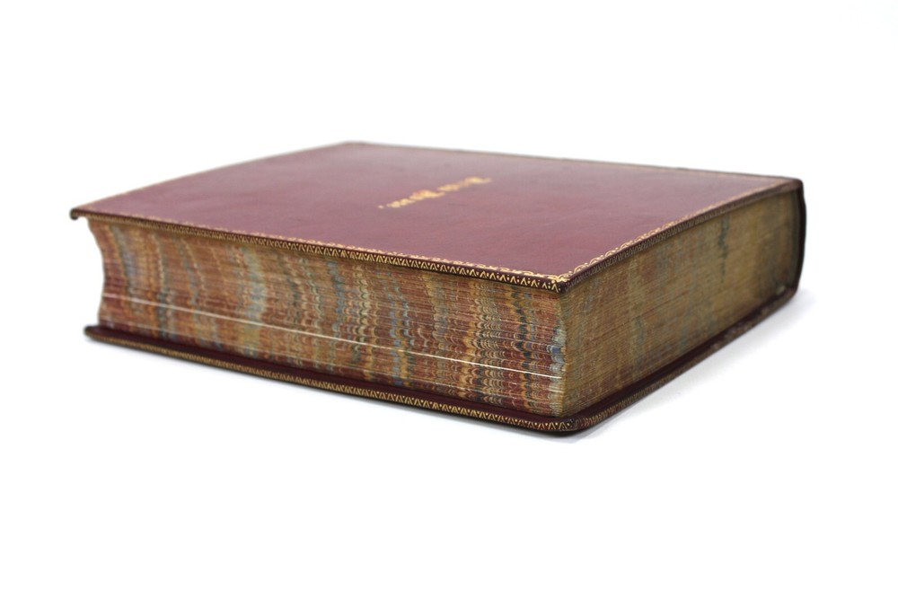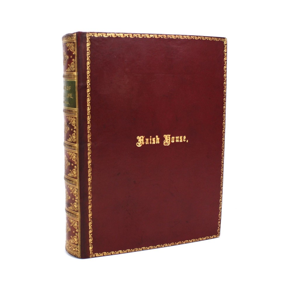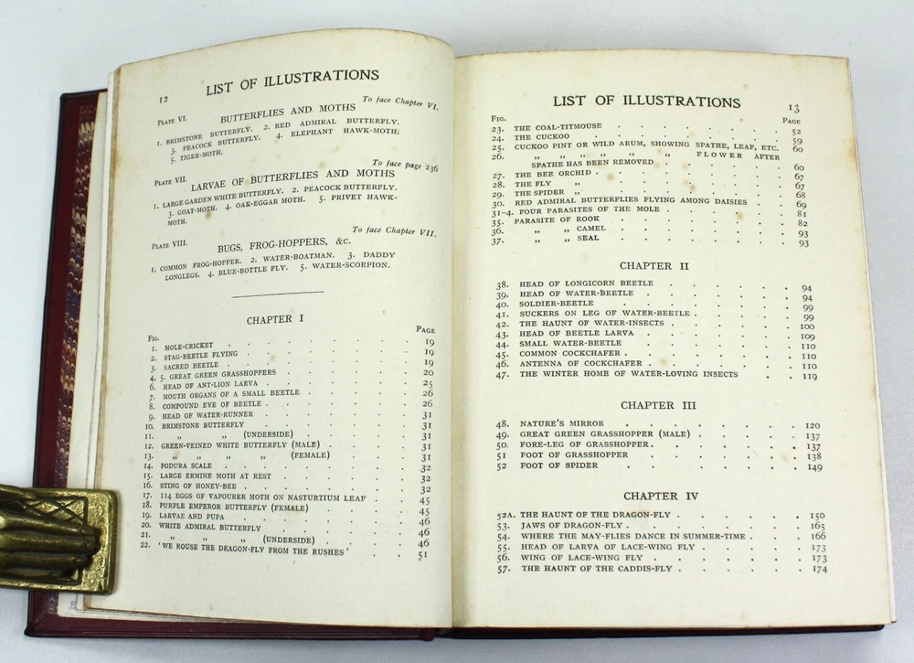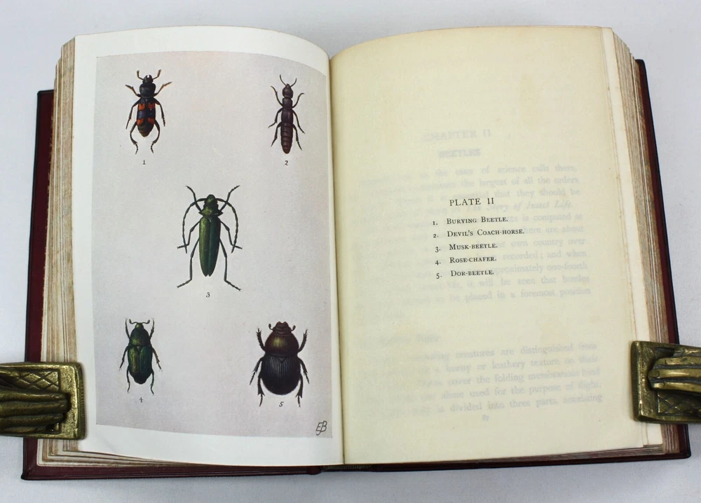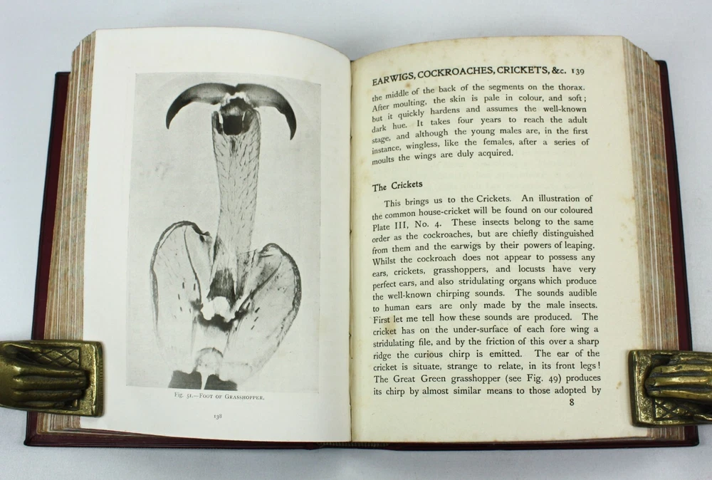 The Story of Insect Life, by W. Percival Westell, F.L.S., M.B.O.U. With 138 Illustrations from Photographs by Messrs. H.W. Shepheard-Walwyn, M.A.; C.F. Oakley; J.H. Crabtree. and others; and Eight Coloured Plates by E.J. Bedford. Published by Robert Culley, London. Undated, but Preface dated to 1907, and prize inscription dated to Xmas 1917. Worldcat lists 1907 as the pubication date. Presumed first edition. Fairly scarce - Worldcat identifies just 20 institutional holdings. A very good full red leather hardback in a full leather prize binding from 'Naish House'. Gilt "Naish House' and border to front cover with tooled gilt spine, raised bands and green morocco title label. Some minor shelf wear to covers. Red feathered marble endpapers, matched to text block edges. 'Star Prize' presentation inscription from a 'Headmaster' to first free endpaper. Inner hinges all intact and soundly bound. The text is generally clean and bright, but with some age spotting to endpapers, title, and first and last few pages. Otherwise there is occasional scattered spotting, particularly to the reverse of the tissue guarded colour plates. Beautifully presented with illustrated coloured plates and black and white photographs throughout. An attractive volume. Text in English. xv + 339pp + Plates with printed tissue guards (all as called for). Dimensions: approx 193mm high x 148mm wide x 42mm deep. Weight: approximately 682g (unpacked). Published by Robert Culley, London. Undated, but Preface dated to 1907, and prize inscription dated to Xmas 1917. Worldcat lists 1907 as the pubication date. Presumed first edition. Fairly scarce - Worldcat identifies just 20 institutional holdings. A very good full red leather hardback in a full leather prize binding from 'Naish House'. Gilt "Naish House' and border to front cover with tooled gilt spine, raised bands and green morocco title label. Some minor shelf wear to covers. Red feathered marble endpapers, matched to text block edges. 'Star Prize' presentation inscription from a 'Headmaster' to first free endpaper. Inner hinges all intact and soundly bound. The text is generally clean and bright, but with some age spotting to endpapers, title, and first and last few pages. Otherwise