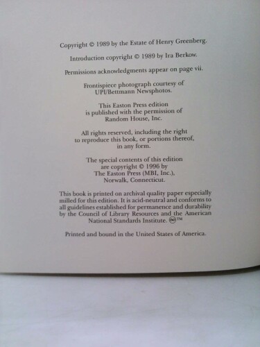 The Story of My Life Easton Press Leatherbound by Greenberg, Hank and Berkow, Ira Minor shelf and handling wear, overall a clean solid copy with minimal signs of use. Boards betray fading and nicks and other signs of wear and imperfection commensurate with age. Binding is tight and structurally sound. Pages without any extraneous marks. Sealed in plastic for shipping. Secure packaging for safe delivery.