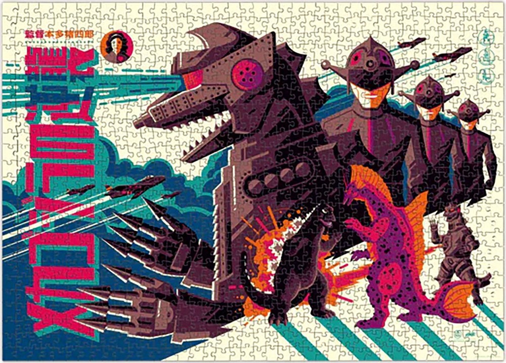 The Terror of Mechagodzilla 1,000 Piece Puzzle [Tom Whalen] The TERROR OF MECHAGODZILLA design from Tom Whalen makes for a perfectly balanced puzzle; it incorporates bold colors, non-english characters, and striking visuals to serve as design keystones for an experience that provides a challenge without feeling impossible. We love that we were able to breathe new life into this illustration and share it with more fans after its debut as a variant poster. Tom Whalen pits Godzilla against MechaGodzilla 2 and Titanosaurus in this work first featured in the GODZILLA: A POSTER SHOW gallery event in March of 2020. This 20" x 28" puzzle features the variant colorway originally available as an edition of 125.