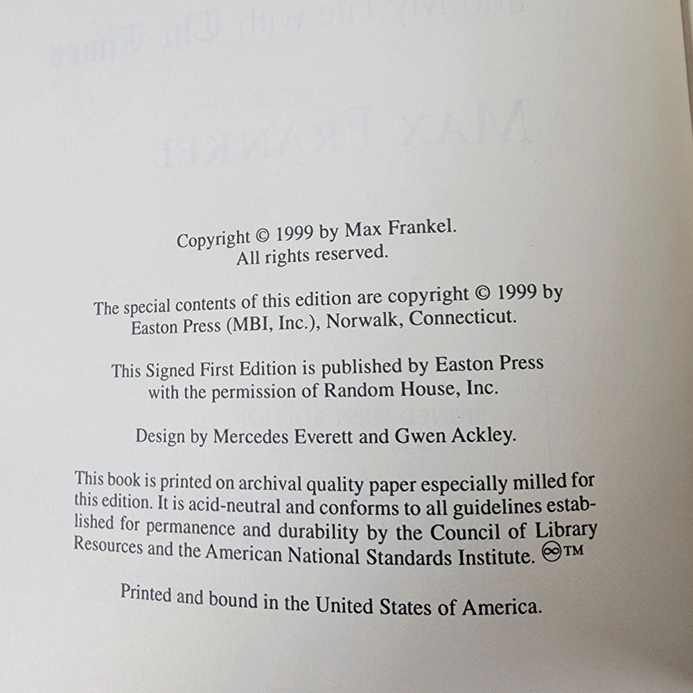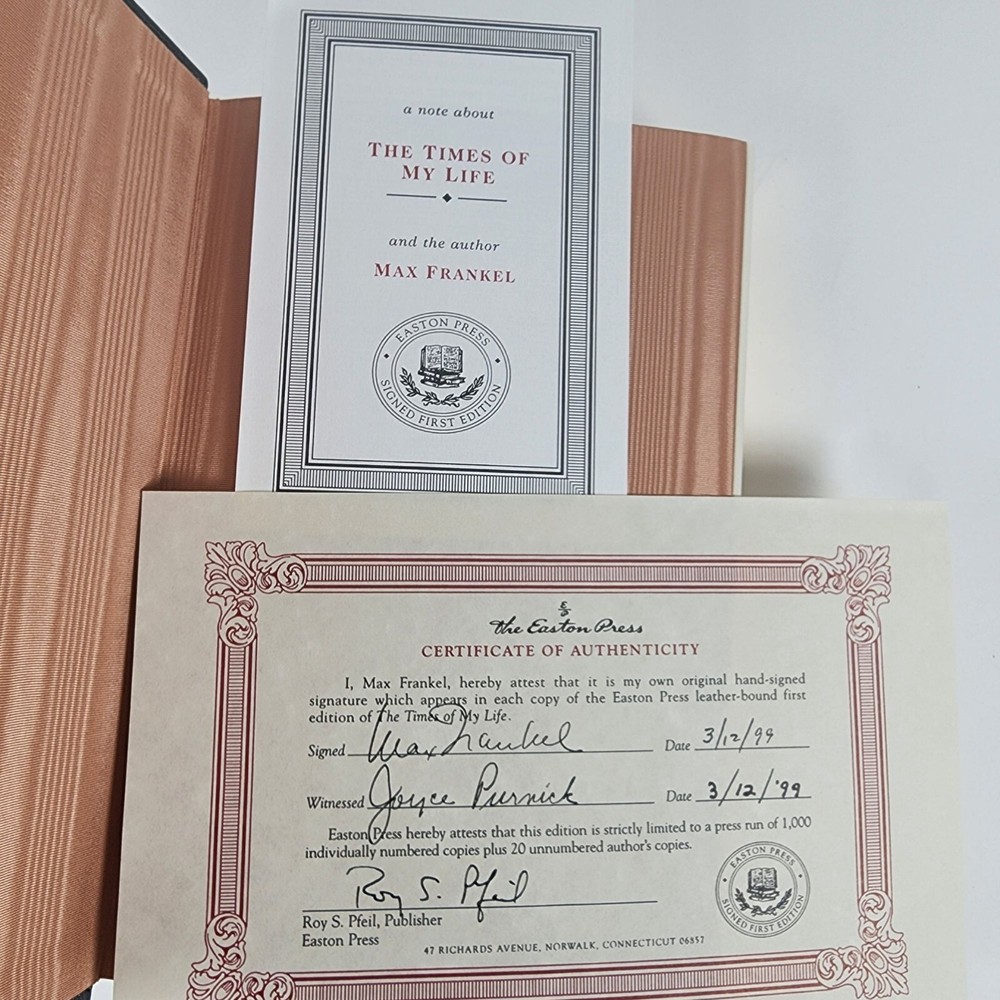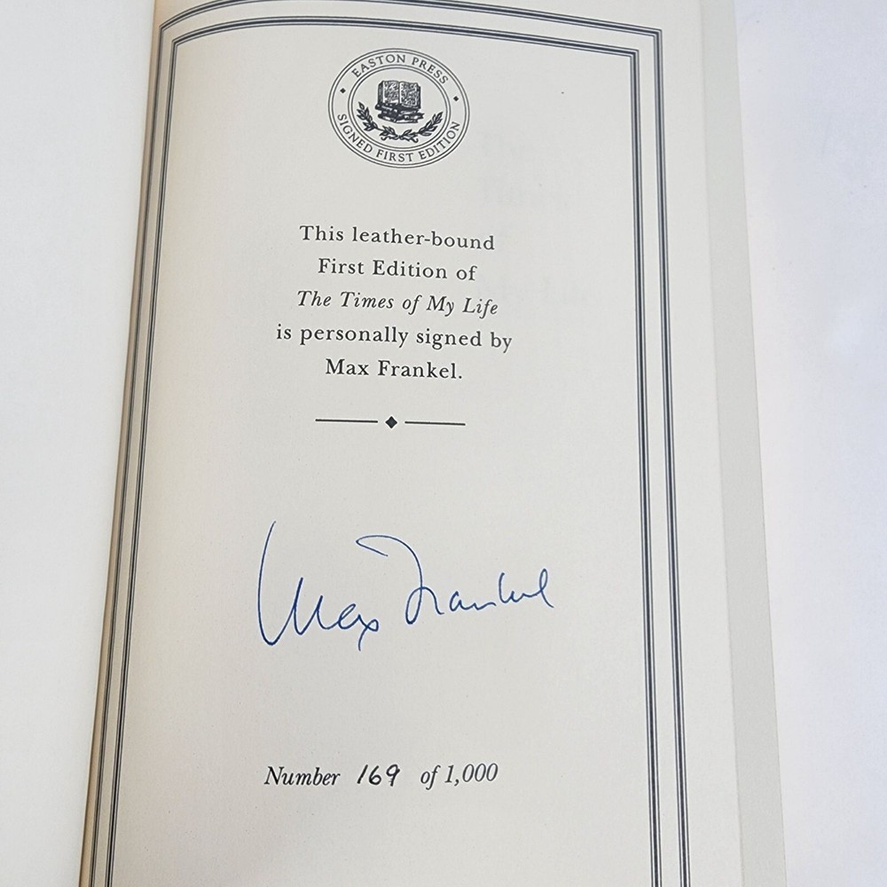 Collectible first edition signed by Max Frankel. Leather-bound by Easton Press. Includes a certificate of authenticity. • Leather-bound cover • Signed by Max Frankel • Certificate of authenticity included • First edition • Published by Easton Press • Gold inlay design 1999 What you see in the pictures is always what you get, we do not use stock photos or other peoples photos to sell our items. Please inspect the photos closely for condition and please do not hesitate to ask questions Condition: Pre-Owned Like New