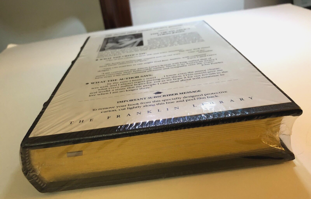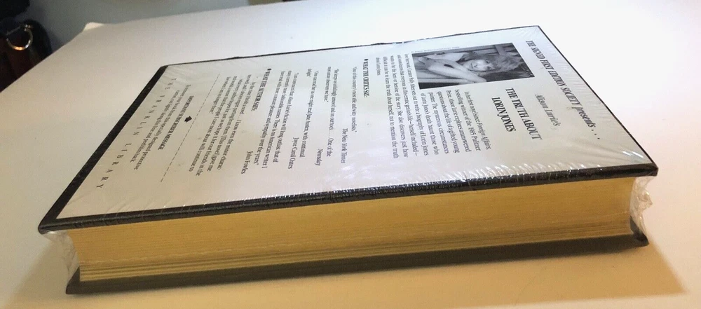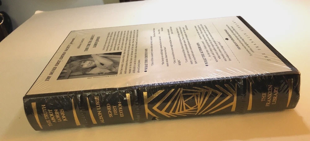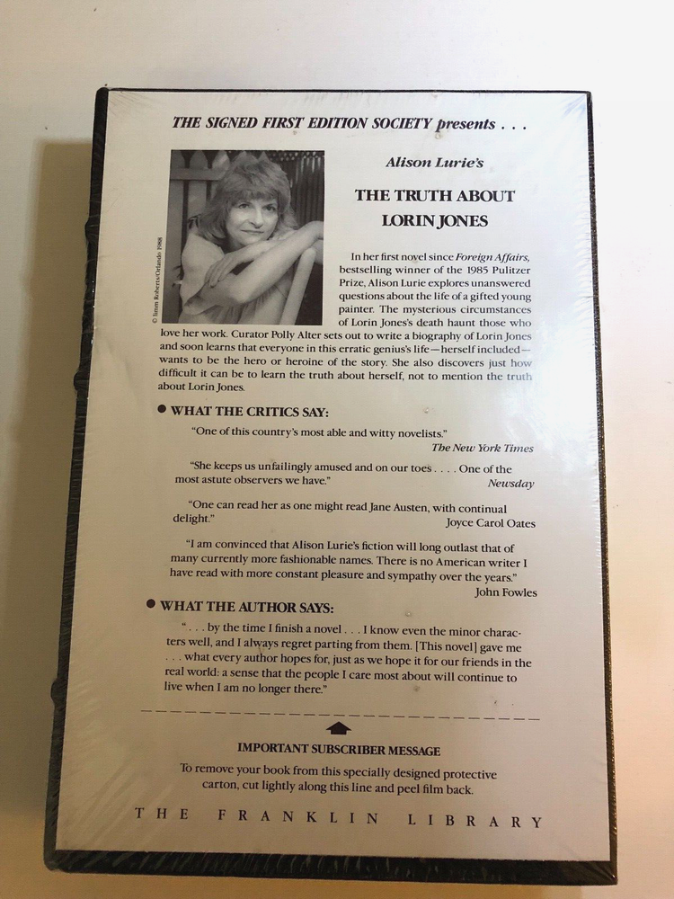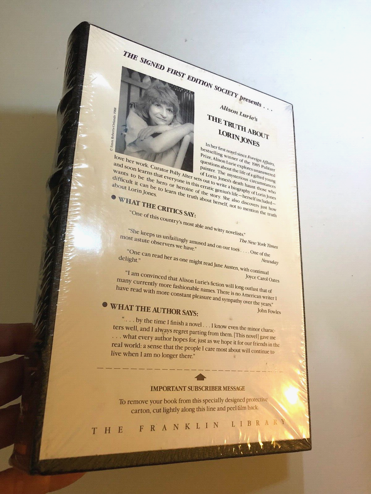 Brand new in original shrink-wrap. The Truth About Lorin Jones by Alison Lurie. Black Leather-bound book with gilt decoration on the cover. With raised his on the spine. Gilt page edges. With sewn in satin bookmark. SIGNED by Alison Lurie. There is surface wear to the shrink-wrap. Small indentation on the front cover as shown in photo. Small tear to shrink-wrap on the spine. Small bump to the cover of the book at the bottom of the spine. Franklin Library. Part of the Signed First Edition Society series. Book measures 6.25 inches by 9.25 inches.