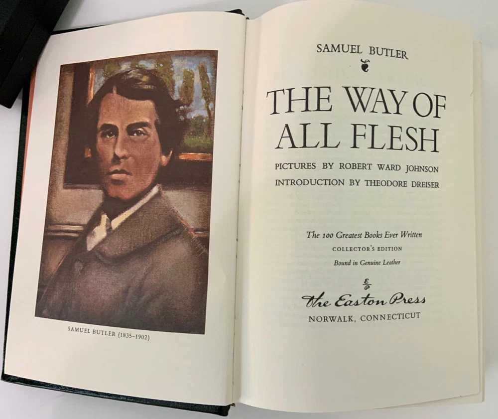 Butler, Samuel T he Way of All Flesh Hardcover Publisher: The Easton Press, Norwalk, Connecticut, 1980 This book is part of The 100 Greatest Books Ever Written collection published by Easton Press. All edges gilt . Covers and spine are decorated and lettered in gilt . Features sewn-in silk bookmark and silk moire end pages. Bound in green leather with three hubs on the spine. This book includes illustrations by American artist Robert Ward Johnson, an introduction by Theodore Dreiser, and a color frontspiece portrait of the author by Richard Sparks. 588 pp. Collector's Edition.