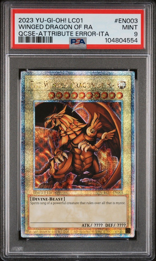 The Winged Dragon Of Ra QCSR card from the Yu-Gi-Oh! TCG's Legendary Collection: 25th Anniversary Edition is a highly sought-after Quarter Century Secret Rare card graded by Professional Sports Authenticator (PSA) as a 9. This Italian language card features the legendary Attribute Error and belongs to the Beast color category, making it a valuable addition to any collector's deck.