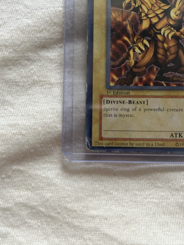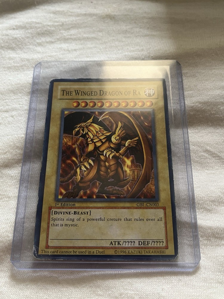 Elevate your Yu-Gi-Oh! TCG collection with the iconic Winged Dragon of Ra, a Gold Secret Rare card that boasts a holographic finish, ensuring it stands out in any collection or tournament deck. With its Divine-Beast attribute, this card represents a formidable presence, capable of turning the tide of battle in your favor. Produced by Konami and dating back to 1996, this 1st Edition GBI-003 card is a true vintage gem. The Winged Dragon of Ra comes from a time when card stock material was the standard, and it has been lightly played, preserving its excellent state. This card is ungraded, allowing you the opportunity to have it professionally assessed to understand its full value.