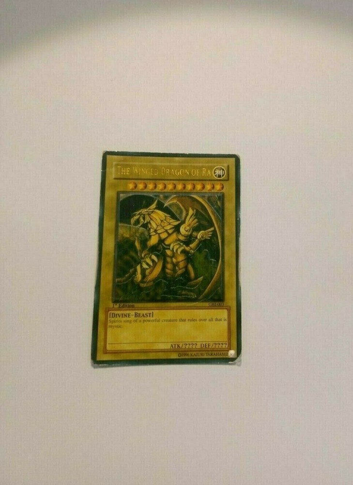 The Winged Dragon of Ra 1st edition GBI-003. This card had a previous owner that used the card often. I became the new owner years ago from a match and never used the card since. It has some minor flaws on the front corners, as shown on the pictures. Other than that the card is alright with a MP condition. It's has a hologram effect
