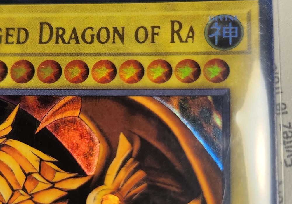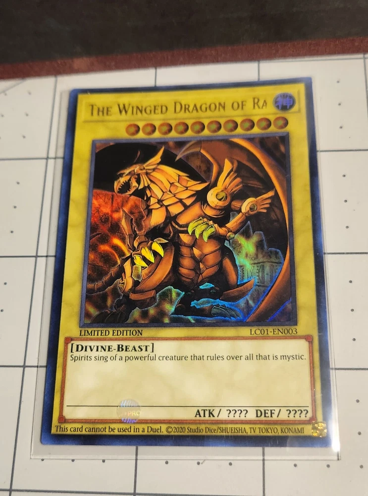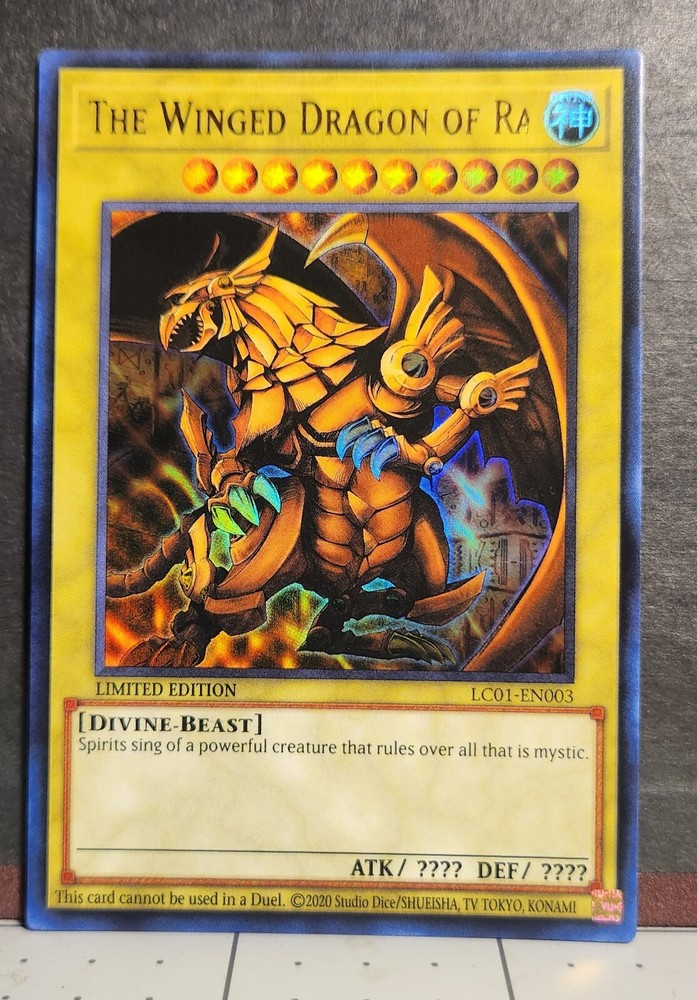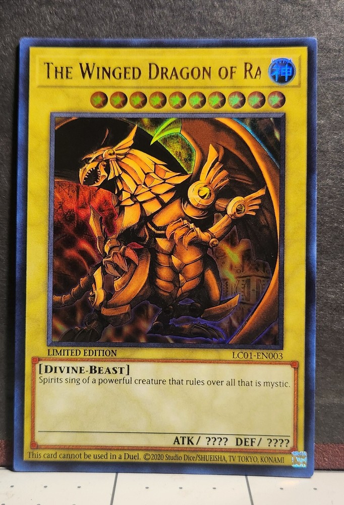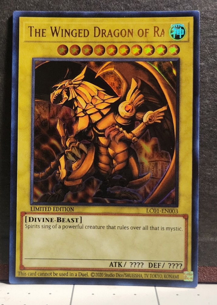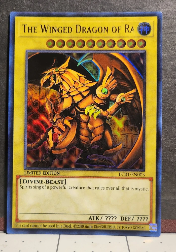 The Winged Dragon of Ra is a Divine-Beast creature card from the Legendary Collection: 25th Anniversary Edition set of the Yu-Gi-Oh! TCG. This Ultra Rare card, featuring a Holo finish, is a Limited Edition version with a misprint. It is in English and has card number LC01-EN003. It is not autographed and is manufactured by Konami.