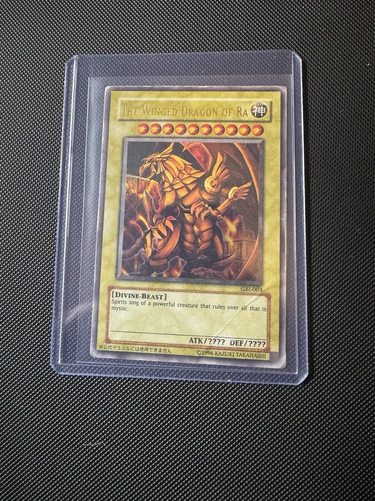 The Winged Dragon of Ra GBI-003 is an ultra rare Yu-Gi-Oh! TCG card from the American God Cards set released in 2003. Illustrated by Kazuki Takahashi, this monster card features a holo finish and is a Game boy promo. The card is part of the Yu-Gi-Oh! character family and is in English language. Produced by Konami on card stock material, The Winged Dragon of Ra is a standard-sized collectible card game item suitable for ages 4 and up.
