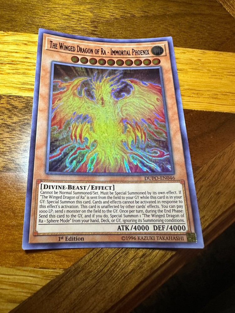 Hello! You are buying one The Winged Dragon of Ra - Immortal Phoenix DUPO-EN046 1st Edition Ultra Rare i n lightly played condition. Reason for lightly played condition is minor general play/scratchwear, mostly on back . See photos for details! As a thank you for buying from me, I will throw in two free Yugioh commons! Thank you so much for looking, have a great day! If there is ever an issue, please let me know so I can do whatever I can to resolve it! Please check out my other items! I have many more single cards!