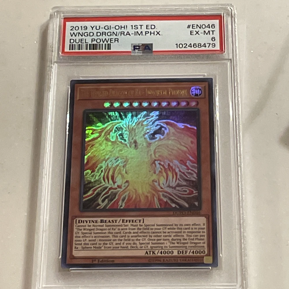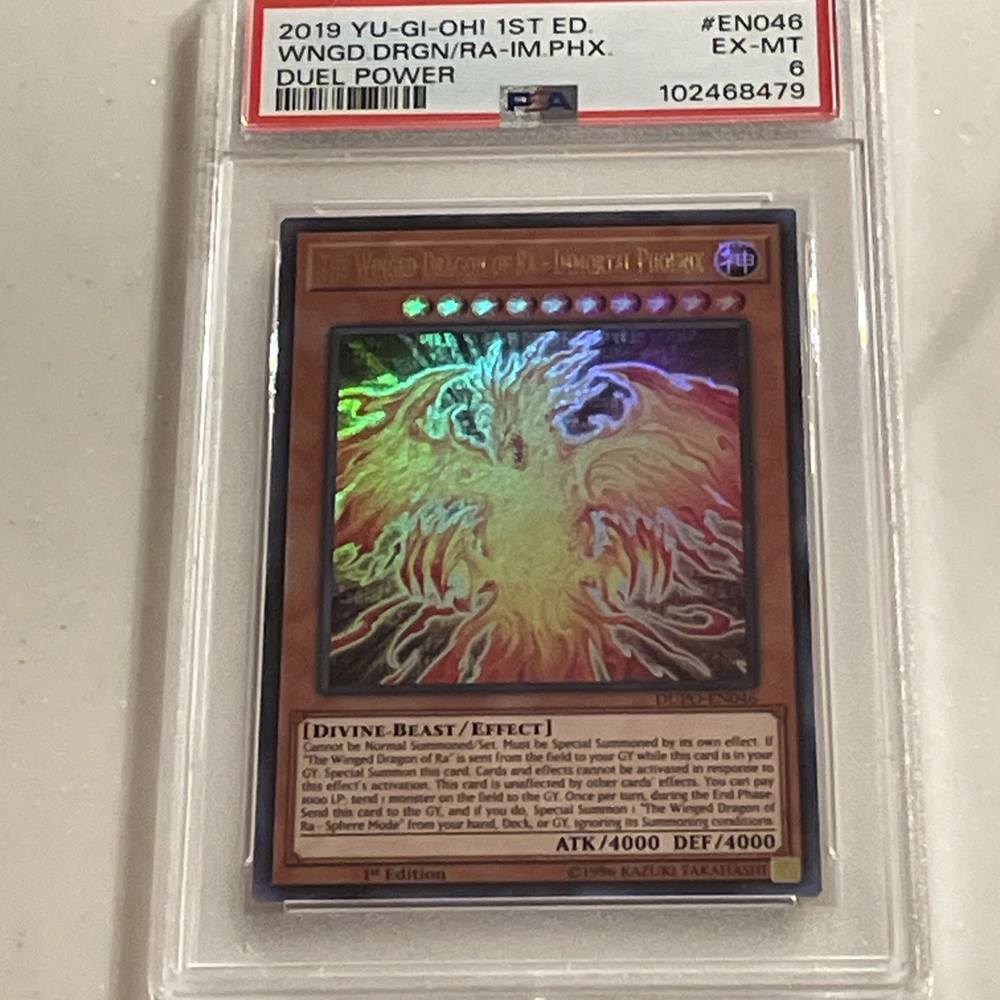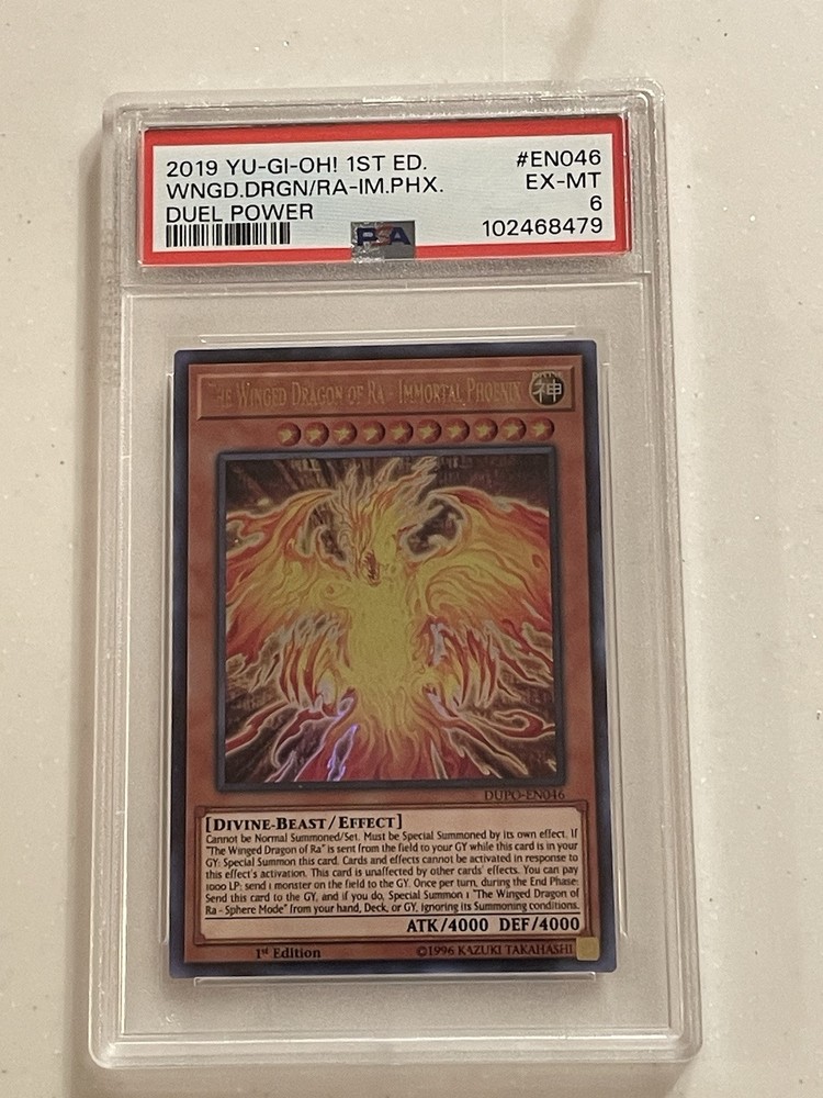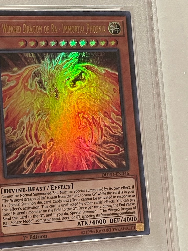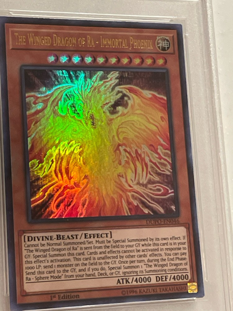The Winged Dragon of Ra - Immortal Phoenix is an Ultra Rare Effect card from the Duel Power set in the Yu-Gi-Oh! TCG. It is a Divine-Beast creature with 4000 Attack/Power and Defense/Toughness. This 1st Edition card features The Winged Dragon of Ra in its Immortal Phoenix form, manufactured by Konami and numbered DUPO-EN046.