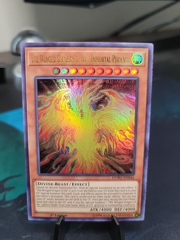 The Winged Dragon of Ra - Immortal Phoenix is a Divine-Beast creature card from the Duel Power set in the Yu-Gi-Oh! TCG. It has 4000 Attack and Defense points, and is an Ultra Rare 1st Edition card. This English card features an Effect ability and is manufactured by Konami with the card number DUPO-EN046.