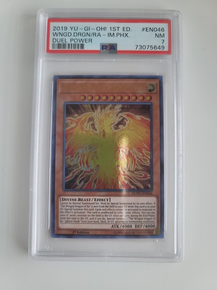 The Winged Dragon of Ra - Immortal Phoenix DUPO-EN046 Yu-Gi-Oh Card 1st PSA 7 PSA 7 Yugioh Card. Ready to go! All items purchased from me are packaged with care. Card singles purchased will be sent in a bubble mailer. For other collectibles items check out my other listings. Thank you.