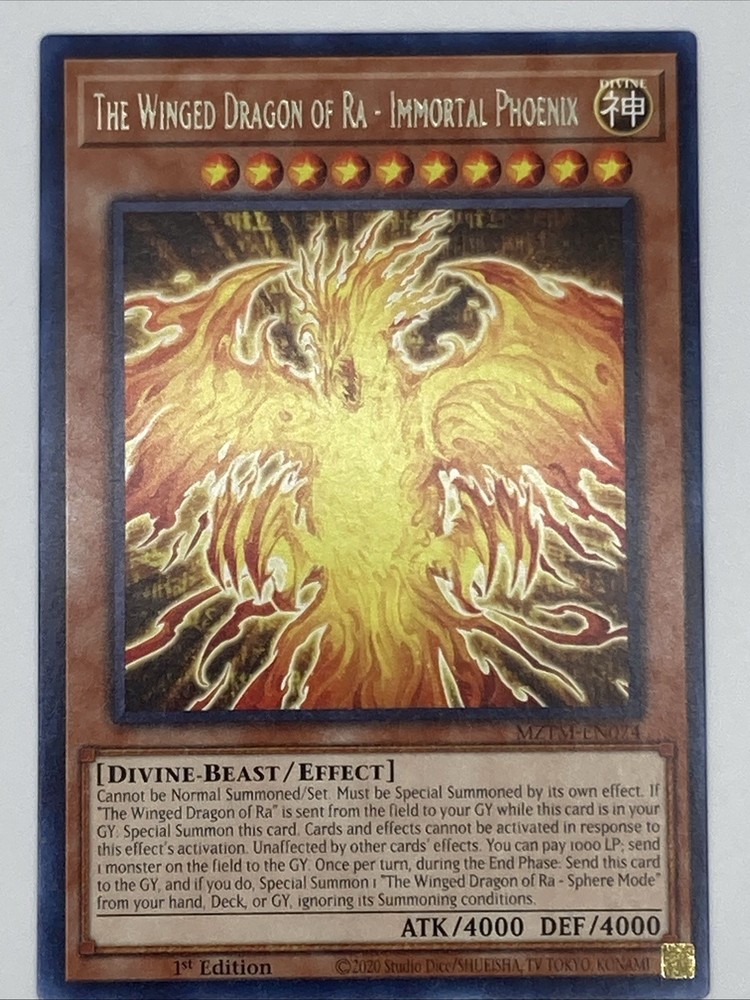 Elevate your Yu-Gi-Oh! TCG collection with the majestic "The Winged Dragon of Ra - Immortal Phoenix" from the Maze of the Master set. Card number MZTM-EN074 features a striking Divine-Beast design with an attack and defense power of 4000, making it a formidable addition to any deck. This rare card boasts the prestige of a 1st Edition release and comes in the standard English language card size. Konami's craftsmanship shines with this Effect-type card that requires no level restriction to be played, suitable for players aged 6 and up. Dive into the lore of the Yu-Gi-Oh! universe with this card that represents the epitome of Divine power and majesty. Thank you for viewing our Yu-Gi-Oh cards on eBay! This card has come straight from the booster pack straight to a penny sleeve. If you have any questions or issues, please do not hesitate to reach out to us! We will do everything we can to assist you! Thank You!
