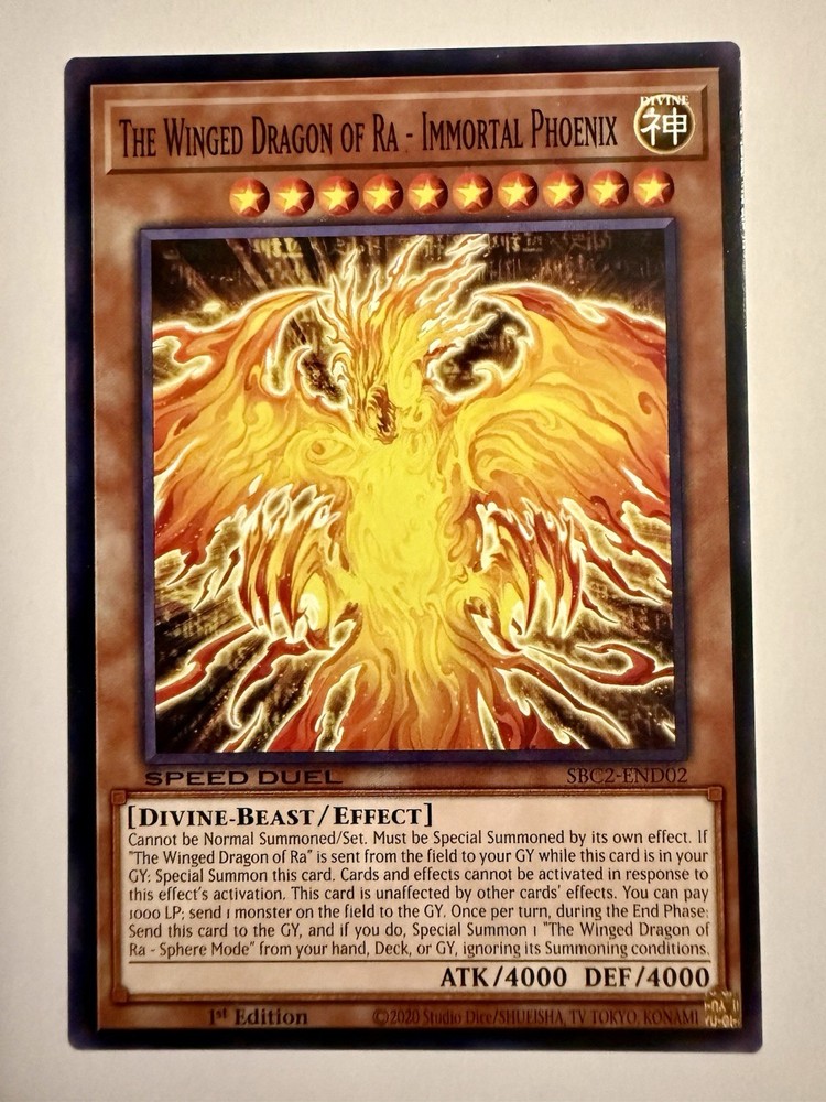 The Winged Dragon of Ra - Immortal Phoenix (SBC2-END02) is a common card in the Yu-Gi-Oh! TCG from the Speed Duel: Battle City Finals set. Manufactured by Konami in the United States, this English language card features the iconic Winged Dragon of Ra design and is part of the 1st Edition release. As a sought-after collectible, this card appeals to fans and collectors of CCG individual cards looking to add a unique and rare piece to their collection.