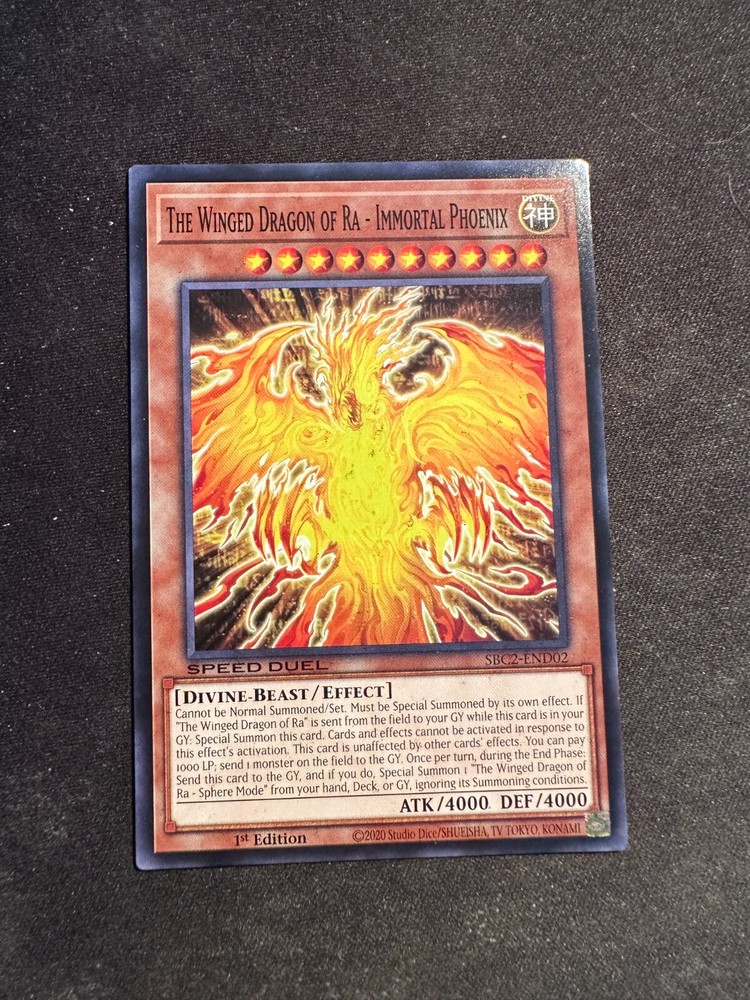 The Winged Dragon of Ra - Immortal Phoenix - SBC2-END02 - Speed Duel N/M Card is 1st Edition Cards are in Near Mint Condition Combined Shipping is offered on all of my TCG Listings. When Checking out with multiple cards in your cart, click ‘Request total from seller’. This will allow me to combine the shipping for multiple cards if purchased together. If this does not show up for you, then please message me and I’ll create a listing for your order. Any Further Questions Please Message Me Thanks