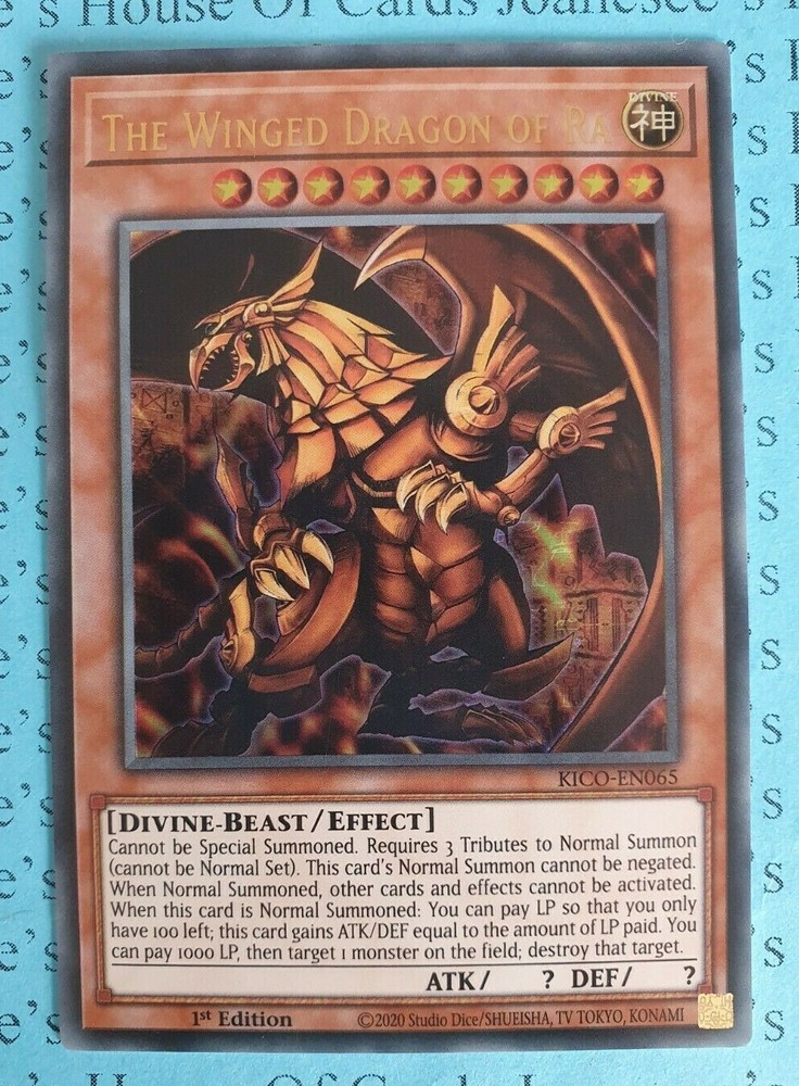 This is an Ultra Rare Holo Divine Divine-Beast New, unplayed and booster fresh. Unfortunately the back of the corners are just not perfect enough for Mint due to poor manufacturing. (See Photos - Card you see is the card you get) The Winged Dragon of Ra 10 Stars ATK/? DEF/? Card text: Cannot be Special Summoned. Requires 3 Tributes to Normal Summon (cannot be Normal Set). This card's Normal Summon cannot be negated. When Normal Summoned, other cards and effects cannot be activated. When this card is Normal Summoned: You can pay LP so that you only have 100 left; this card gains ATK/DEF equal to the amount of LP paid. You can pay 1000 LP, then target 1 monster on the field; destroy that target. KICO-EN065 1st Edition English Mint/Near MInt Condition Totally Original Konami (or your money back!) I will deliver in safe packaging to keep it in perfect condition. Ideal for players and collectors alike. Check out my other items! I will combine postage costs for multiple purchases. Sign up for my email newsletters by adding my eBay Shop to your favourites