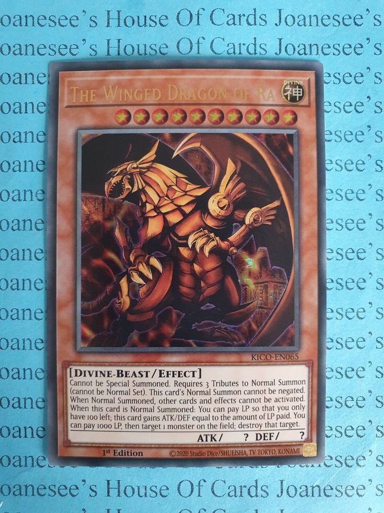 This is an Ultra Rare Holo Divine Divine-Beast New, unplayed and booster fresh. Unfortunately the back of the corners are just not perfect enough for Mint due to poor manufacturing. (See Photos - Card you see is the card you get) The Winged Dragon of Ra 10 Stars ATK/? DEF/? Card text: Cannot be Special Summoned. Requires 3 Tributes to Normal Summon (cannot be Normal Set). This card's Normal Summon cannot be negated. When Normal Summoned, other cards and effects cannot be activated. When this card is Normal Summoned: You can pay LP so that you only have 100 left; this card gains ATK/DEF equal to the amount of LP paid. You can pay 1000 LP, then target 1 monster on the field; destroy that target. KICO-EN065 1st Edition English Mint/Near MInt Condition Totally Original Konami (or your money back!) I will deliver in safe packaging to keep it in perfect condition. Ideal for players and collectors alike. Check out my other items! I will combine postage costs for multiple purchases. Sign up for my email newsletters by adding my eBay Shop to your favourites