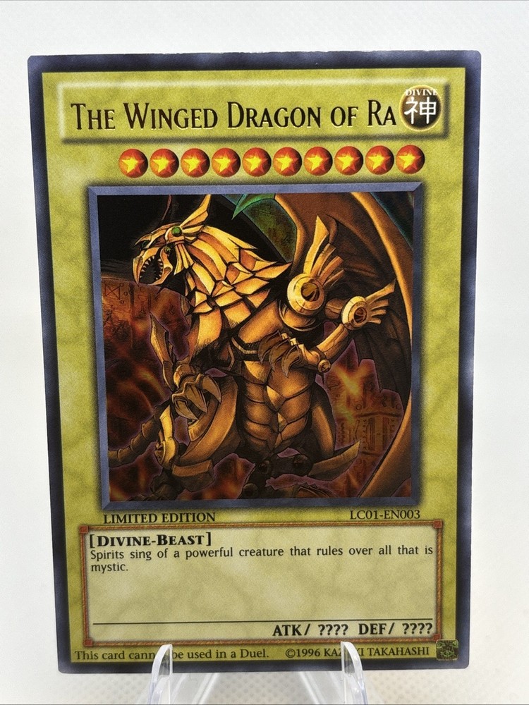 This ultra rare card from the Yu-Gi-Oh Legendary Collection 1 is a must-have for any serious collector. Featuring the powerful creature/monster type of Divine-Beast, The Winged Dragon of Ra card is a normal type card with attack and defense power of 0. It is a limited edition card with card number LC01-EN003 and is in English language. The card is manufactured by Konami and has a rarity of Ultra Rare. It is perfect for playing in the Yu-Gi-Oh! TCG game. Don't miss the chance to add this divine card to your collection.