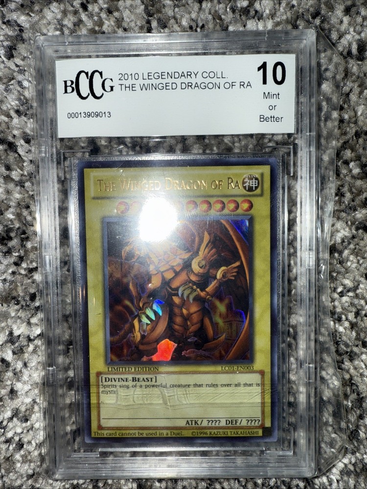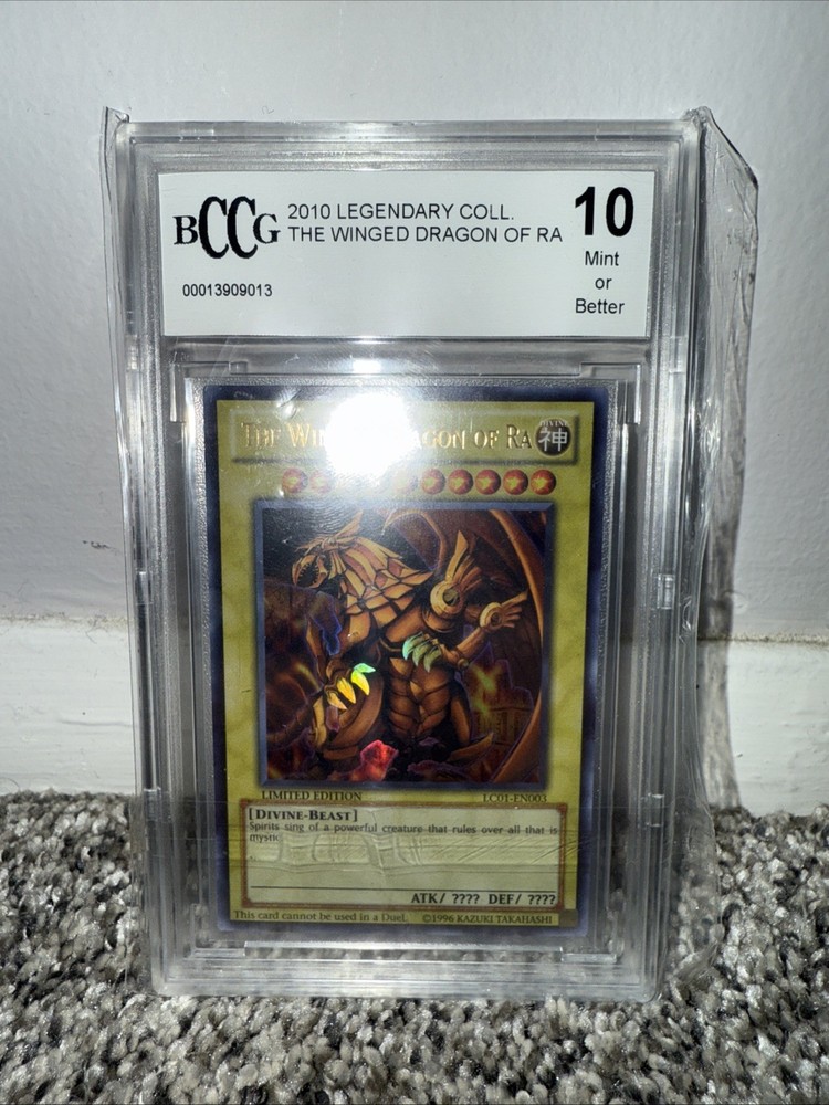 Unleash the power of Legendary Collection 1 with "The Winged Dragon of Ra" card, an iconic addition to any Yu-Gi-Oh! TCG collection. This Ultra Rare Divine-Beast card boasts an attack and defense that's sure to overwhelm opponents. Its unique card number, LC01-EN003, marks it as a limited edition piece from the esteemed manufacturer, Konami. Proudly presented in English and dated back to 2010, this card is a true vintage gem. It comes professionally graded by Beckett Collectors Club Grading (BCCG) with a pristine grade of 10, ensuring its top-notch quality. Celebrate your love for the game with this revered piece from the Yu-Gi-Oh! Legendary Collection 1.