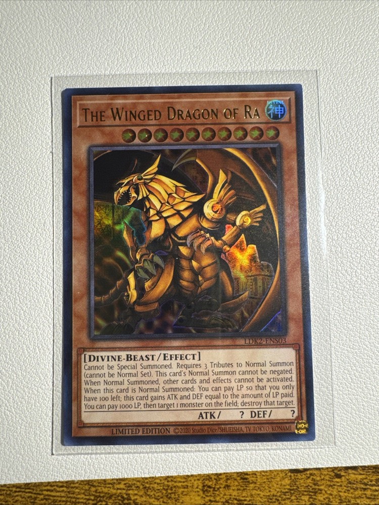The Winged Dragon of Ra LDK2-ENS03 is an ultra rare card from the Yu-Gi-Oh! TCG's Legendary Decks II-Limited Edition set. This divine-beast card, manufactured by Konami, features the "Effect" card type with a powerful attack power and defense. With its limited edition status and English language, this card is a highly sought-after collectible for fans of the game.