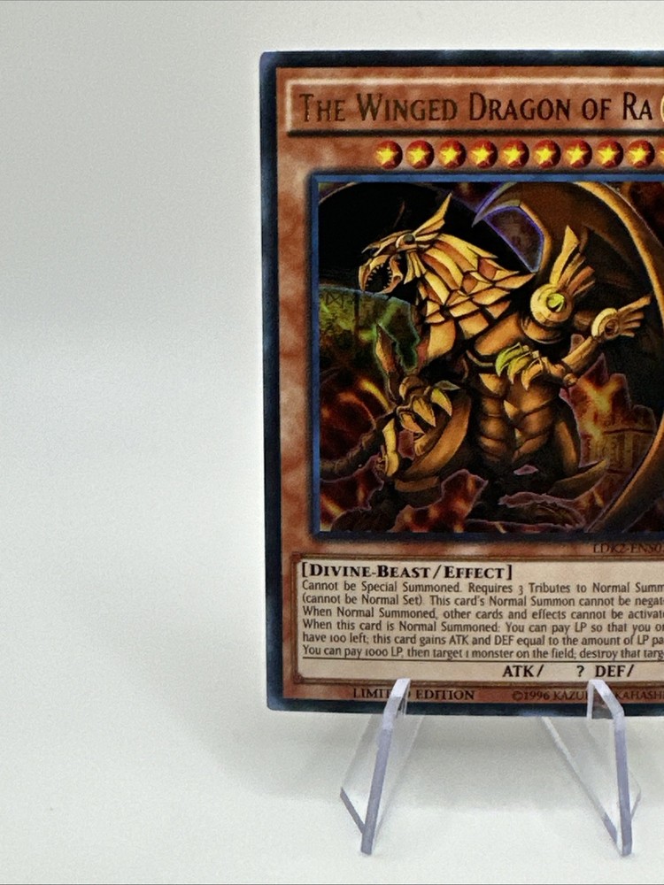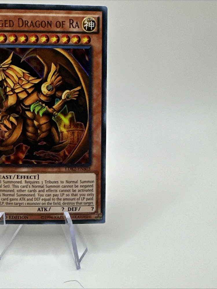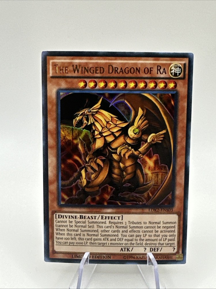 Cannot be Special Summoned. Requires 3 Tributes to Normal Summon (cannot be Normal Set). This card's Normal Summon cannot be negated. When Normal Summoned, other cards and effects cannot be activated. When this card is Normal Summoned: You can pay Life Points so that you only have 100 left; this card gains ATK and DEF equal to the amount of Life Points paid. You can pay 1000 Life Points, then target 1 monster on the field; destroy that target. Number: LDK2-ENS03 Rarity: Ultra Rare Attribute Monster Type/Card Type: DIVINE Divine-Beast/Effect Monster Level: 10 A / D: 0 / 0 Near Mint, Never Played. No Wear on corners or holo. Beautiful Design.