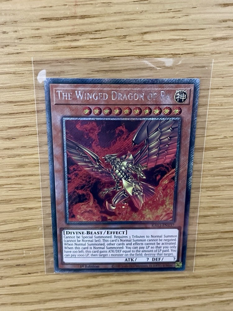 The Winged Dragon of Ra : Platinum Secret Rare 1st Edition YuGiOh Card • Set: RA03: Quarter Century Bonanza • Rarity: Platinum Secret Rare • Edition: 1st Edition • Card Category: Effect Monster • Language: English • Print: European/Printed in Belgium • Condition: Mint/Near Mint
