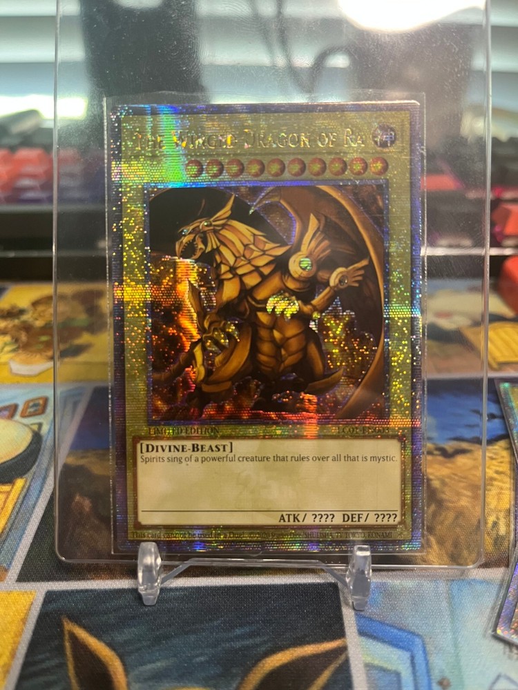 Unleash the power of Egyptian mythology with "The Winged Dragon of Ra," a Quarter Century Secret Rare card from the Legendary Collection: 25th Anniversary Edition. This awe-inspiring Divine-Beast card, numbered LC01-EN003, is a must-have for collectors and players alike, offering both strategic gameplay and a prized spot in any collection. Featuring limited edition status and the prestigious attributes of the Divine color, this Yu-Gi-Oh! TCG card is crafted by Konami and comes in English language. Delve into the lore and might of "The Winged Dragon of Ra," and elevate your game with this legendary piece.