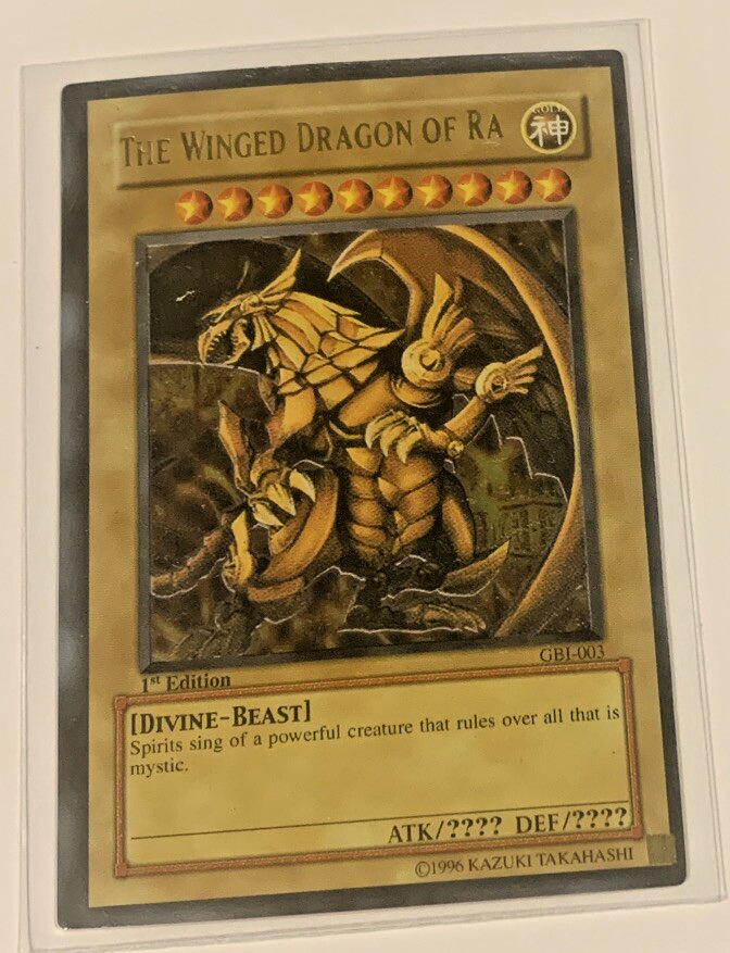 Level up your Yu-Gi-Oh! TCG collection with the mythical might of The Winged Dragon of Ra, a Secret Rare gem from the Duel Monsters International: Worldwide Edition set. Card number GBI-003 features the iconic Divine-Beast in all its glory, ready to bolster your deck with its awe-inspiring power. This Unlimited edition of The Winged Dragon of Ra comes straight from Konami, ensuring authentic quality for collectors and players alike. With its Light attribute and a hefty presence on the battlefield, this card is a strategic asset for those looking to ascend their game play. As seen in photo. 1st edition card.