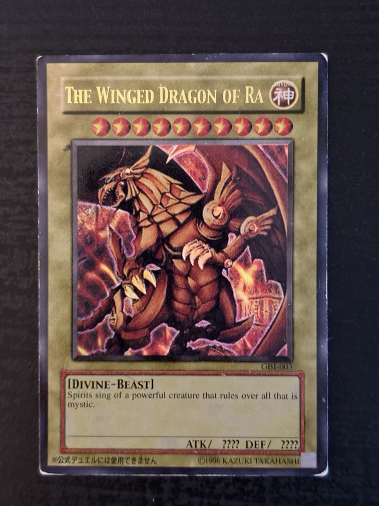 The Winged Dragon of Ra is a Divine-Beast creature card in the Yu-Gi-Oh! TCG. This Limited Edition Ultra Rare card, from the Yu-Gi-Oh! Duel Monsters International: Worldwide Edition set, has 0 Attack/Power and 0 Defense/Toughness. It is in English and manufactured by Konami with card number GBI-003.