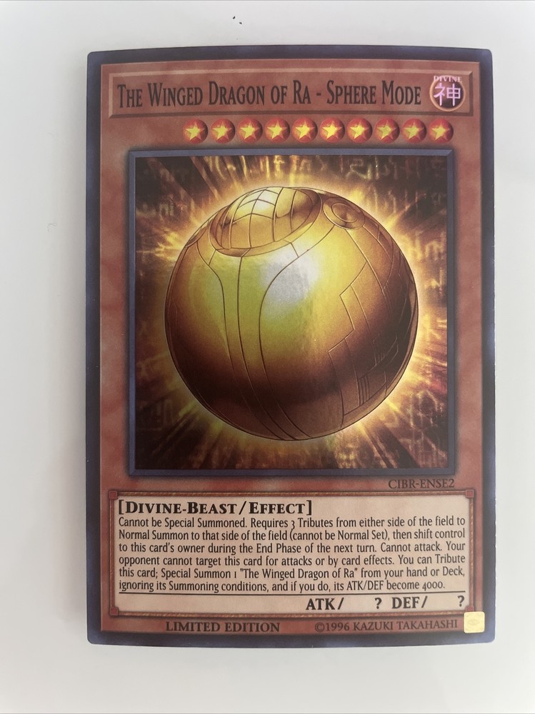 This limited edition super rare Yu-Gi-Oh! TCG card boasts the majestic power of The Winged Dragon of Ra - Sphere Mode. With its unique features and CIBR-ENSE2 card number, this collectible item is sure to be a valuable addition to any card game collection. Its rarity status also makes it a highly sought after item for avid Yu-Gi-Oh! fans. Get your hands on this impressive card today!
