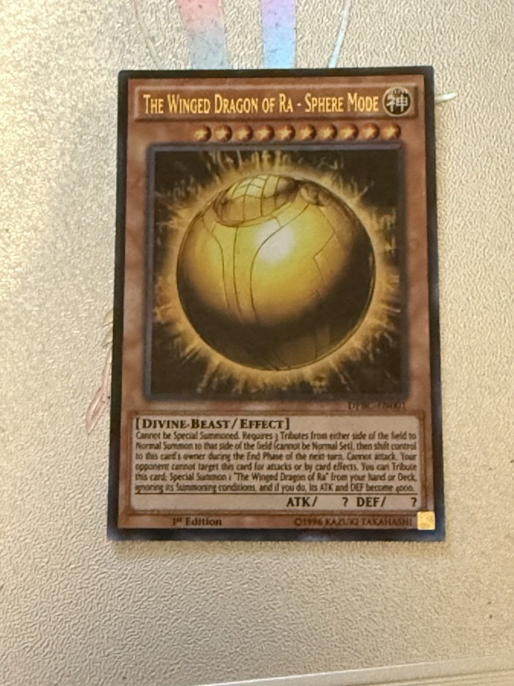 Elevate your Yu-Gi-Oh! TCG collection with the mythical power of The Winged Dragon of Ra - Sphere Mode, card number DPBC-EN001. From the iconic - Battle City - set, this Ultra Rare divine-beast card is a must-have for both seasoned players and collectors. Its unique Effect type brings a strategic edge to your game, allowing you to harness its divine attributes to your advantage. With its 1st Edition status, this card is a treasure from the respected manufacturer Konami, presented in English for easy integration into your deck. The Winged Dragon of Ra comes in a sphere mode, adding a distinct visual appeal to its already impressive presence. Enhance your game experience and make a statement with this remarkable card.
