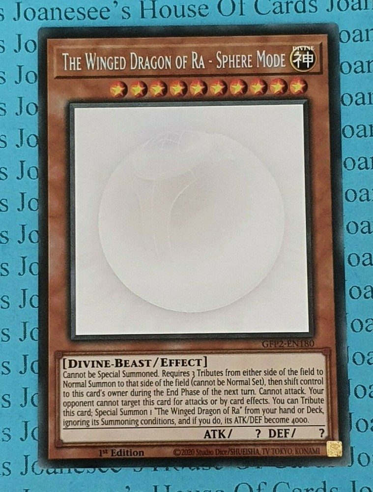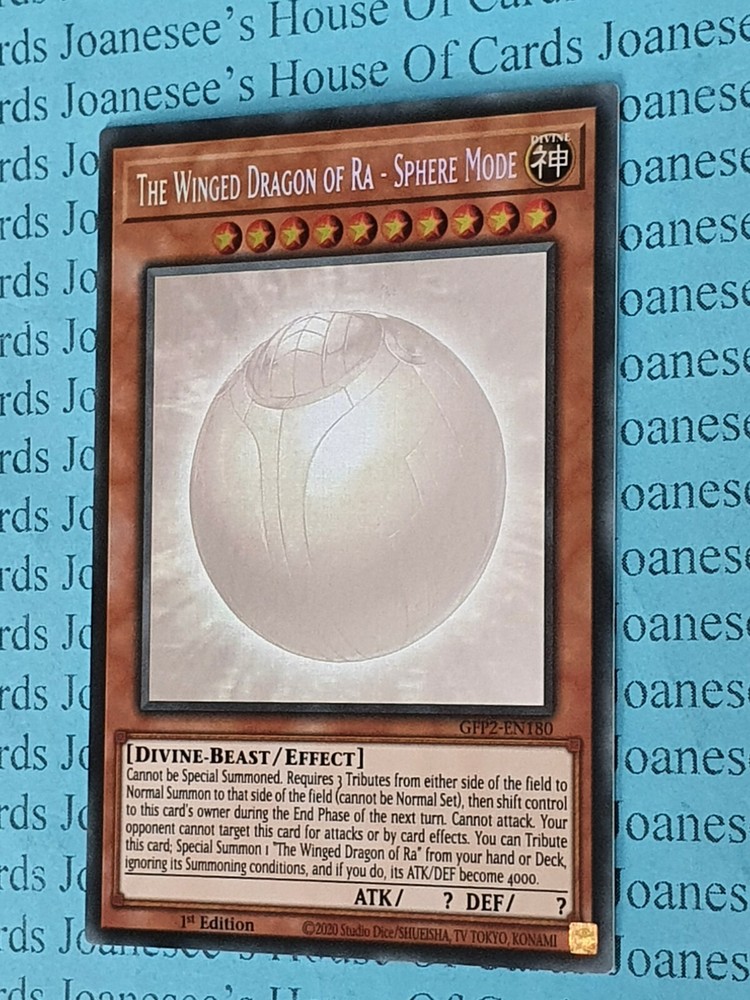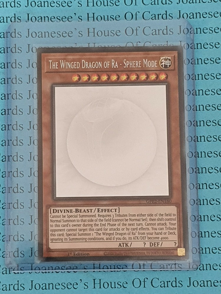This is a Ghost Rare Holo Light Divine-Beast The Winged Dragon of Ra - Sphere Mode 10 Stars ATK/? DEF/? Card text: Cannot be Special Summoned. Requires 3 Tributes from either side of the field to Normal Summon to that side of the field (cannot be Normal Set), then shift control to this card's owner during the End Phase of the next turn. Cannot attack. Your opponent cannot target this card for attacks or by card effects. You can Tribute this card; Special Summon 1 "The Winged Dragon of Ra" from your hand or Deck, ignoring its Summoning conditions, and if you do, its ATK/DEF become 4000. GFP2-EN180 1st Edition English Mint/NMint Condition Totally Original Konami (or your money back!) I will deliver in safe packaging to keep it in perfect condition. Ideal for players and collectors alike. Check out my other items! I will combine postage costs for multiple purchases. Sign up for my email newsletters by adding my eBay Shop to your favourites