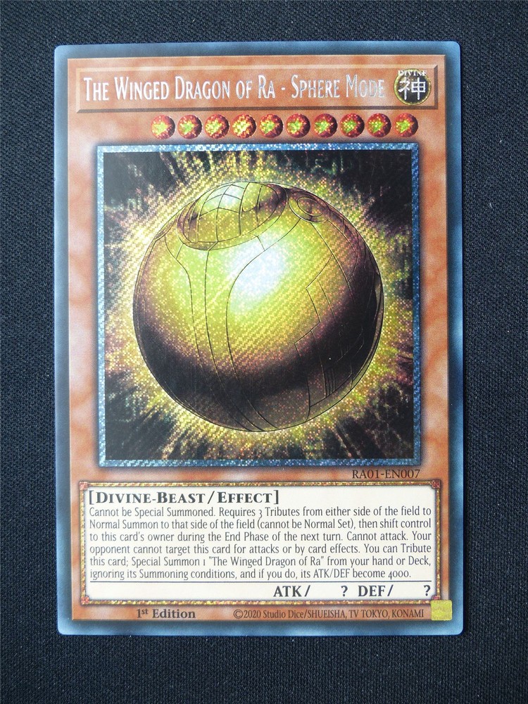 The Winged Dragon of Ra - Sphere Mode RA01 Secret Rare - 1st ed Yugioh Card #9LN Our stock code: DAISY08-9LN Used. Card is in great condition but is used not new - It may have VERY slight wear - please see the picture - this is the card for sale, not a stock picture. Only pay shipping once no matter how many single cards you order! Offer includes worldwide shipping! If you would like any further information about this item, or have any problems with our products or with our service please get in touch with us - We'll do our best to help!