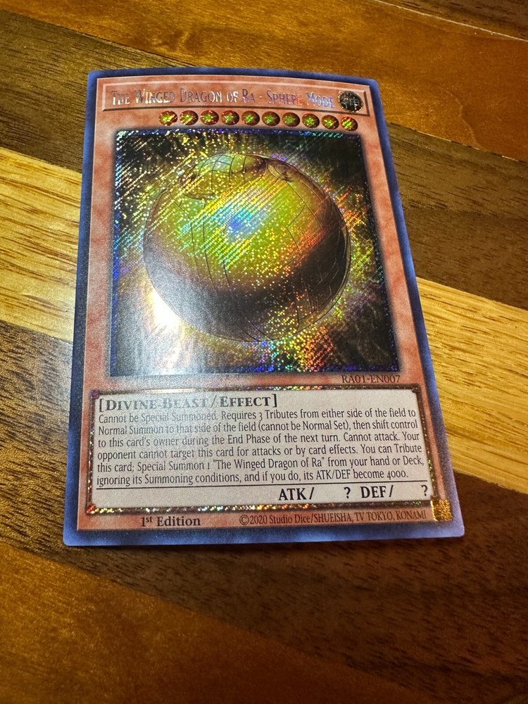 Hello! You are buying one The Winged Dragon of Ra - Sphere Mode RA01-EN007 1st Edition Platinum Secret Rare in near-mint condition! As a thank you for buying from me, I will throw in two free Yugioh commons! Thank you so much for looking, have a great day! If there is ever an issue, please let me know so I can do whatever I can to resolve it! Please check out my other items! I have many more single cards!