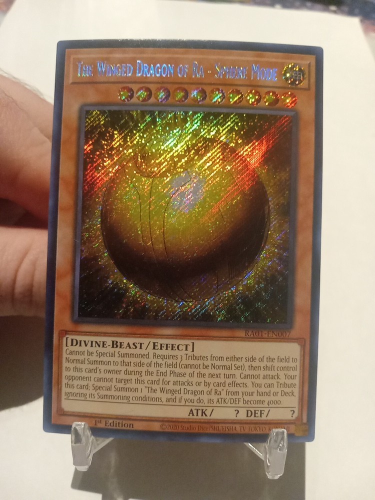 The Winged Dragon of Ra - Sphere Mode is a Secret Rare card from the 25th Anniversary Rarity Collection in the Yu-Gi-Oh! TCG. Manufactured by Konami, this 1st Edition card (RA01-EN007) is in English and features the Divine attribute. It is a Divine-Beast Creature/Monster Type with an Effect card type.