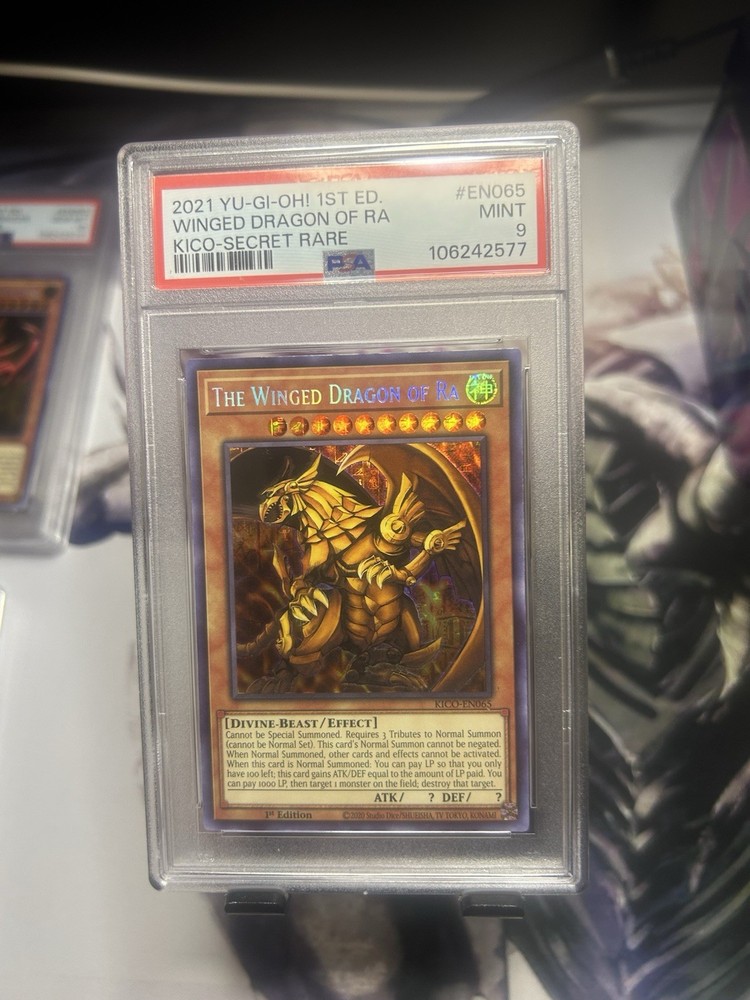 The Winged Dragon of Ra Yugioh 2021 KICO-EN065 Pharaoh's Secret Rare 1st PSA 9 is a highly sought-after collectible card from the Yu-Gi-Oh! TCG. This first edition card features Yami Yugi, Yami Marik, Yugi Muto, and Marik Ishtar in the character attribute, with a grade of 9 from Professional Sports Authenticator (PSA). The card belongs to the King's Court set and has a foil finish, making it a valuable addition to any Yu-Gi-Oh! card collection.