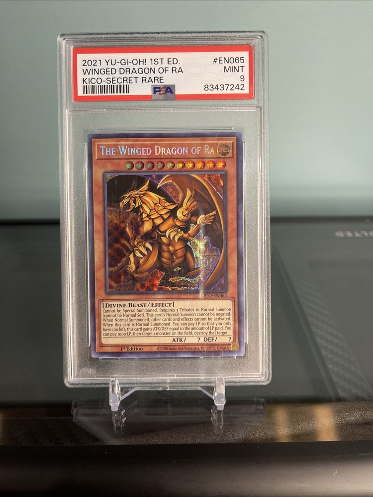 The Winged Dragon of Ra from the Yu-Gi-Oh! TCG's King's Court set is a Secret Rare card. This English card, with a 1st Edition feature, has a graded attribute/MTG:colour. Manufactured by Konami in 2021, it is an Effect card with the card number KICO-EN065. This foil card is highly sought after and comes in a PSA 9 rating.