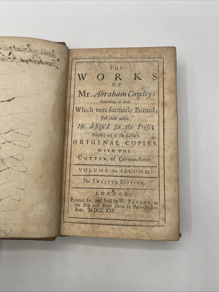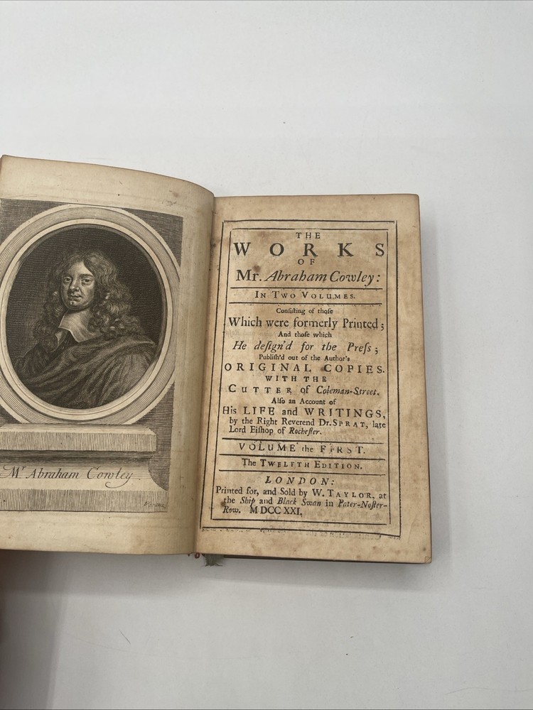 This is a rare and collectible book titled "The Works Of Mr. Abraham Crowley In Two Volumes" published in 1721. The book is bound in leather and was published in London by W. Taylor At The Ship And Black Swan. The author is listed as the Right Reverend Dr. Sprat Late Lord Bishop, and the book is categorized as a biography and autobiography. The book is an original copy and was printed in the United Kingdom. Volume 1 & 2 have 829 pages tight binding and clean interior / front board is detached on volume 1 Volume 2 is sound with tight binding Nice condition for age