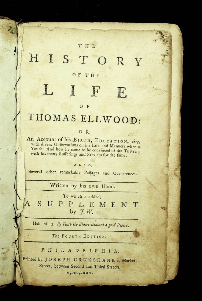 Ellwood, Thomas, 1639-1713. history of the life of Thomas Ellwood; or, An account of his birth, education, &c. / Written by his own hand. To which is added a supplement by J. W. 4th ed. Philadelphia : Printed by J. Crukshank, 1775. Errors in pagination: p. 191 numbered 161; p. 316 numbered 216. Hardcover Ex libris
