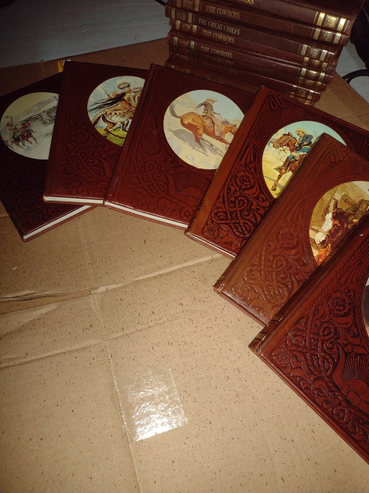 Faux leather bound book series chronicling the history of the American West The leather covers are covered with beautiful tribal type patterns. The leather itself is plush and very similar to the leather found in the King Ranch F-150 trucks. A great gift for anyone that loves the Old West. Each book in this set goes into great detail of just about every aspect of the Wild West. Full color photos and illustrations Ornate cameo cover design unique to each book Published by Time Life as a serial throughout the 1970's Sold separately so you can fill in the gaps in Grandma's set or start your own collection Subjects available: The Great Chiefs The Texans The Railroaders The Indians The Pioneers The Scouts The Forty-Niners The Soldiers The Rivermen The Townsmen The End and the Myth The Trailblazers The Expressmen The Gunfighters And many more A great addition to any collection.