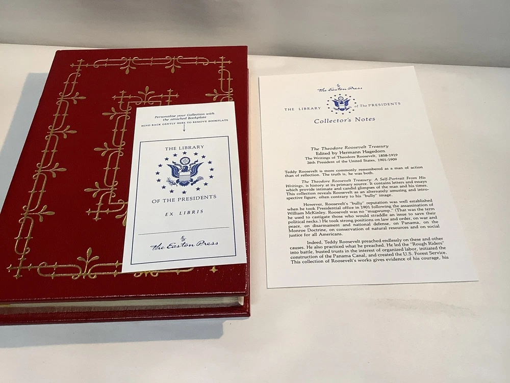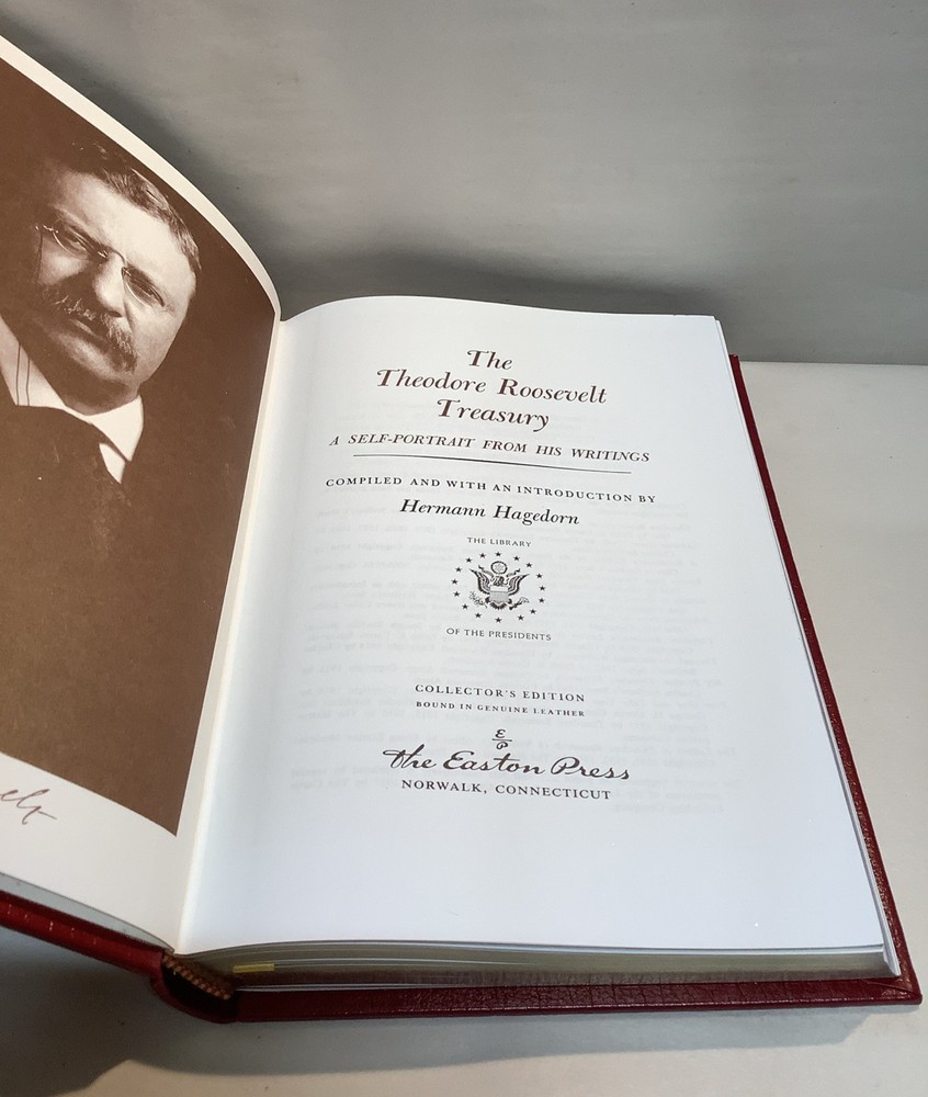 The Theodore Roosevelt Treasury, published by Easton Press in 1988, is a luxurious collector's edition book featuring the historical works of Theodore Roosevelt. This leather-bound original edition, printed in the United States, is a special addition to any book collection. The book provides insightful biographical and autobiographical information about the renowned author, making it a valuable and timeless piece for enthusiasts of American history and biography. Please make sure to review all the pictures and ask any questions you may have, as I would like to avoid dealing with refunds or returns.
