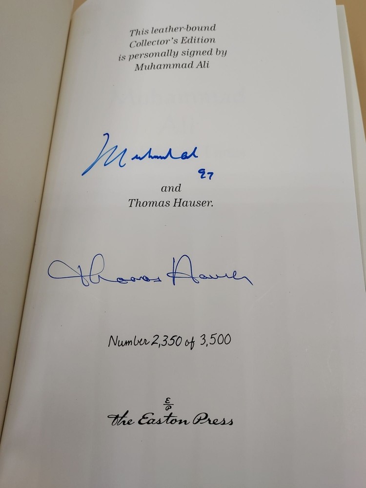 Muhammad Ali: His Life and Times Author: Hauser, Thomas Title: Muhammad Ali: His Life and Times Publication: Norwalk, CT: The Easton Press, 1996 Edition: Collector's Edition Description: Leather bound. SIGNED. 543pp. Octavo [24 cm] Red leather with raised bands, gilt and black ink stamped titles and decorative borders on the spine and front cover, and an illustrated paper label on the front cover. All edges gilt. Orange moire endsheets. Silk ribbon page marker. With light rubbing to the extremities, and a small scratched area on the rear board. The text block has dropped just a little, and there is a former owner's Easton Press bookplate on the rear pastedown. Signed by Muhammad Ali and Thomas Hauser on the limitation page. Number 2,350 of 3,500. From the Preface- "This book is not an attempt to mythologize Ali. It's an effort to show him as he was and is: a superb human being with good qualities and flaws. In his twenties, he was arguably the greatest fighter of all time. But more importantly, he reflected and shaped the social and political currents of the age in which he reigned. Ali in the 1960s stood for the proposition that principles mattered, that equality among people was just and proper, that the war in Vietnam was wrong." Seller ID: 47211 Subject: Sports Ken Sanders Rare Books Ken Sanders Rare Books is a full-service antiquarian bookshop in downtown Salt Lake City. We have a vast inventory of used and rare books, a handful of new books, and an ever-changing selection of art, ephemera, maps, photographs, and postcards. We specialize in Utah & the Mormons and Western Americana, with emphases on the Grand Canyon and the Colorado River, Yellowstone, and other national parks. The literary West is well-represented here, with deep selections of Edward Abbey, Wallace Stegner, B. Traven, and more. We offer rare and collectible books in many subjects, including Literature, Art, Photography, Children's and Illustrated Books, and Wordless Novels. Proprietor Ken Sanders has been buying, selling and collecting books since childhood. He co-owned and ran the legendary Cosmic Aeroplane Bookstore in the 1970s and founded Dream Garden Press , our in-house publishing company, in 1980. Terms & Guarantee All orders ship within 2 business days after receiving payment. Standard mail is USPS Media Mail. Delivery typically takes 7-10 business days. Expedited and international shipping options are also available. All items are guaranteed to be as described or they may be returned within 30 days of receipt for a full refund (prior notice appreciated). We are members of the ABAA (Antiquarian Booksellers Association of America) and the Independent Online Booksellers Association (IOBA), and we adhere to these associations' strict ethical guidelines and conditions of sale. Feedback We leave feedback for buyers once they have posted feedback for us. If you are unhappy with any aspect of a transaction with us, please contact us immediately. We work hard to keep buyers happy and to resolve the rare problem promptly. This listing was created by Bibliopolis.